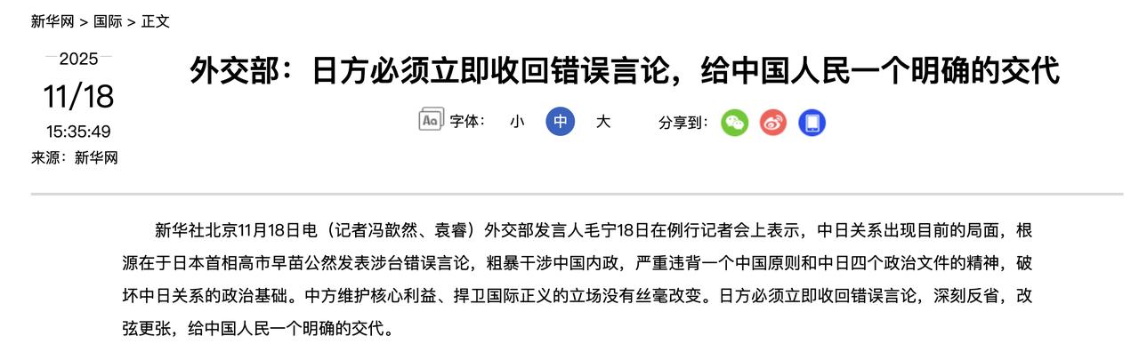 从新华社11月18日发布“日方必须立即收回错误言论,给中国人民一个明确交代”的消息来看,高市早苗内阁现在依然没有意识到事态的严重性。 距离11月7日高市早苗以首相身份发表“台湾有事,日本出兵侵华”言论已经11天,但日方没有任何悔改,据日媒报道,高市早苗很可能在12月26日恶意参拜放置二战甲级战犯牌位的倭庙。 个人观点: 1、日方派出外务省亚洲大洋洲局局长金井正彰来华,其主要目的不是来道歉,而是要求中方撤回驻大阪总领事薛剑,同时妄图说服中方,让中方接受“高市早苗的言论没那么严重”的结论。 2、既然知道日本没有任何诚意,就不应允许日本派一个司局级外交官员访华,这令日方误认为中方的底线红线具有弹性。 3、日方在不断试探和冲撞中方的底线,现在高市早苗敢叫嚣“台湾有事,日本就出兵侵华”,下次高市早苗就敢宣扬“满蒙是日本生命线”。 4、抗议10000次,不如轰炸机在日本东京投下1次燃烧弹。要学习美国,以真理服人。