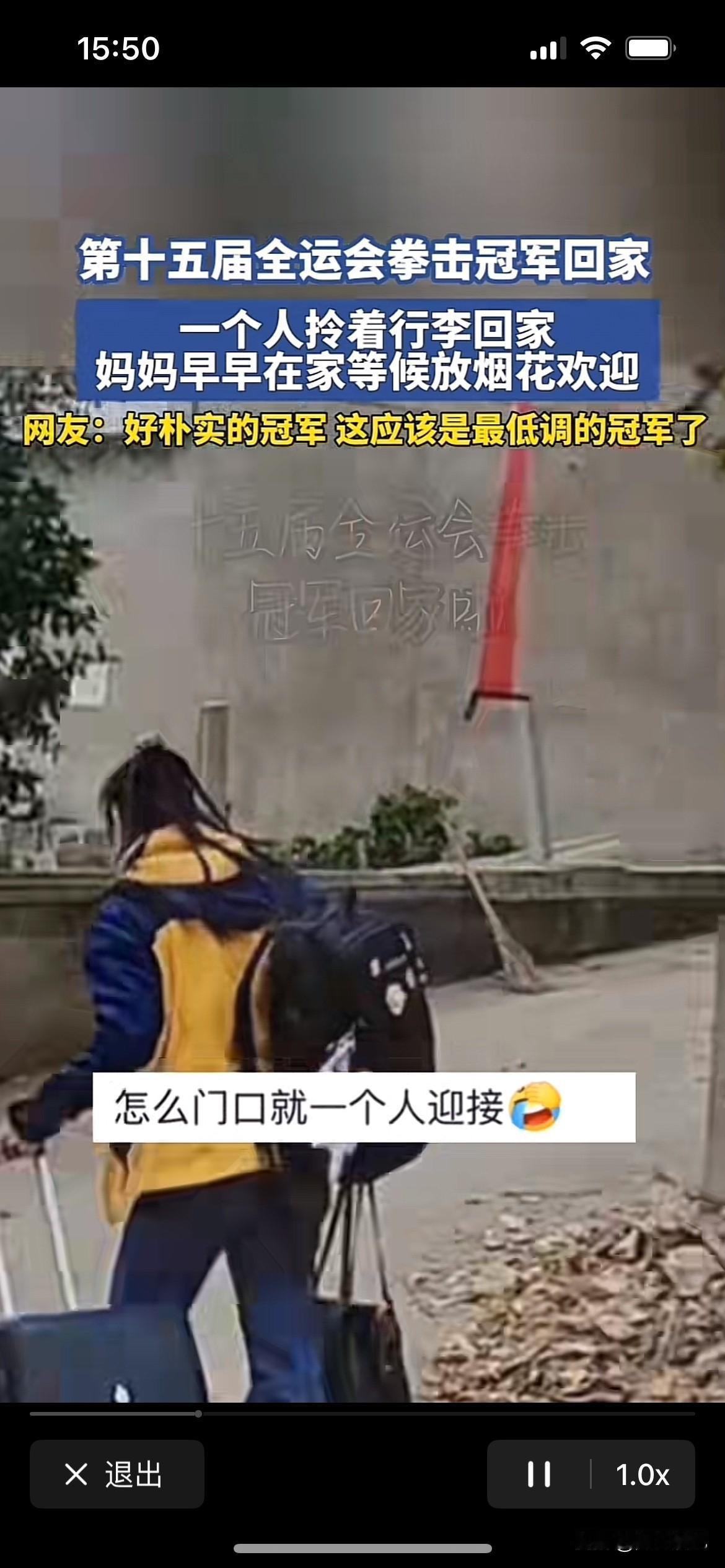 这个全运会冠军是谁,只有妈妈一个人欢迎,冷冷清清的,村里没有大张旗鼓,也没有村民夹道欢迎,自己领着行李箱就回家,真的很心寒,相比之下看看王伟莹回家,村里铺好地毯,村民村委欢迎,跟过年一样热闹。 每一个冠军,都来自不易,那是一日复一日的努力和汗水换来的,值得去敬佩和弘扬,这是一个家族,一个宗族,甚至一个城市的骄傲。