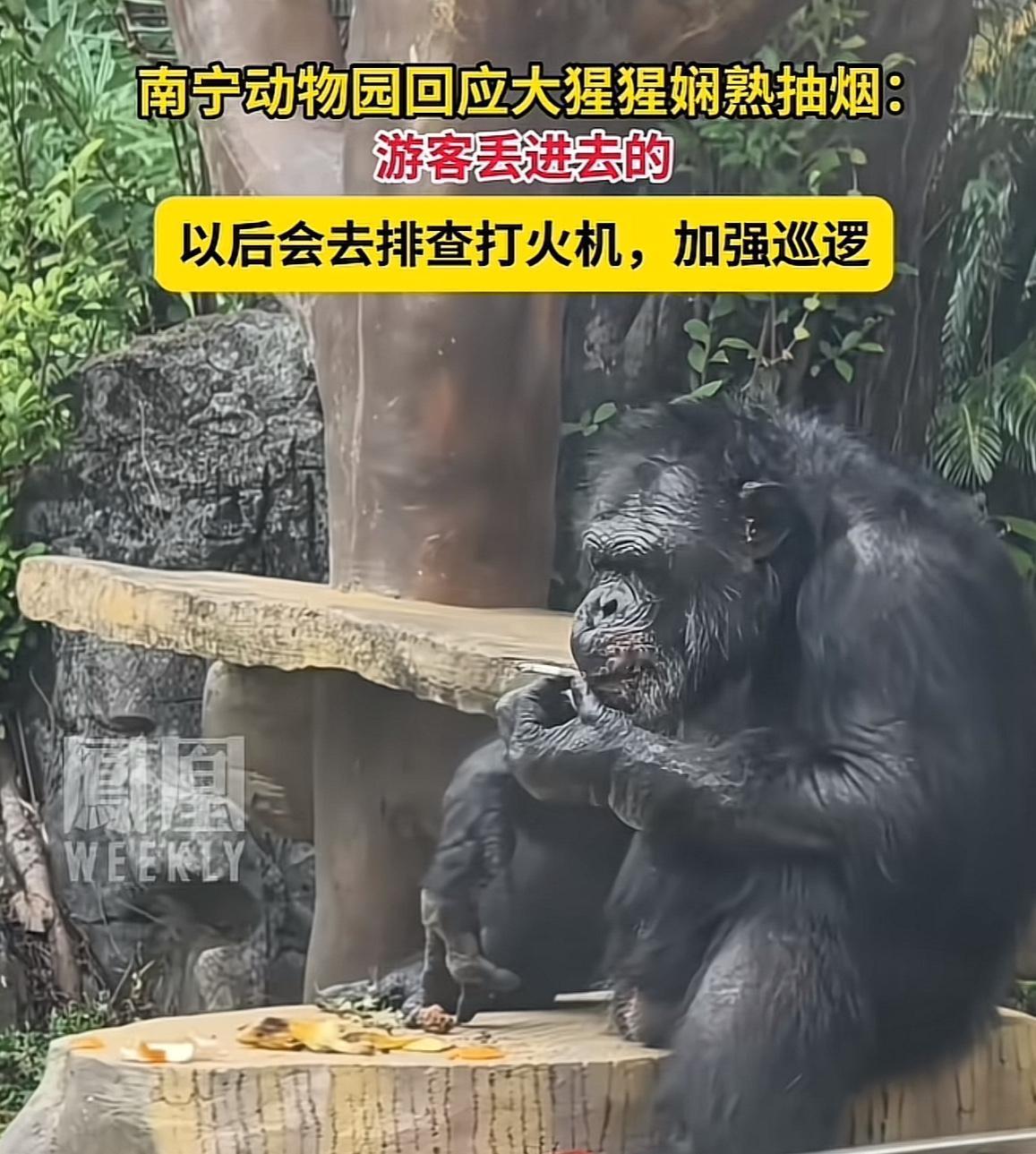 哈哈!大猩猩也抽上烟了[捂脸] 广西南宁动物园里一个大猩猩,能够娴熟的抽烟,还