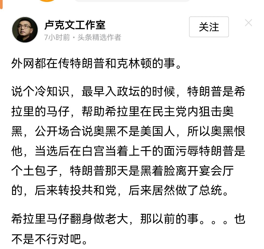 卢克文说特朗普似乎曾经是希拉里的马仔,帮她的罪过奥黑,这个说法我还是信的!美国总统中最大赢家不是特靠谱,也不是奥黑哥,都是克林顿啊[呲牙]