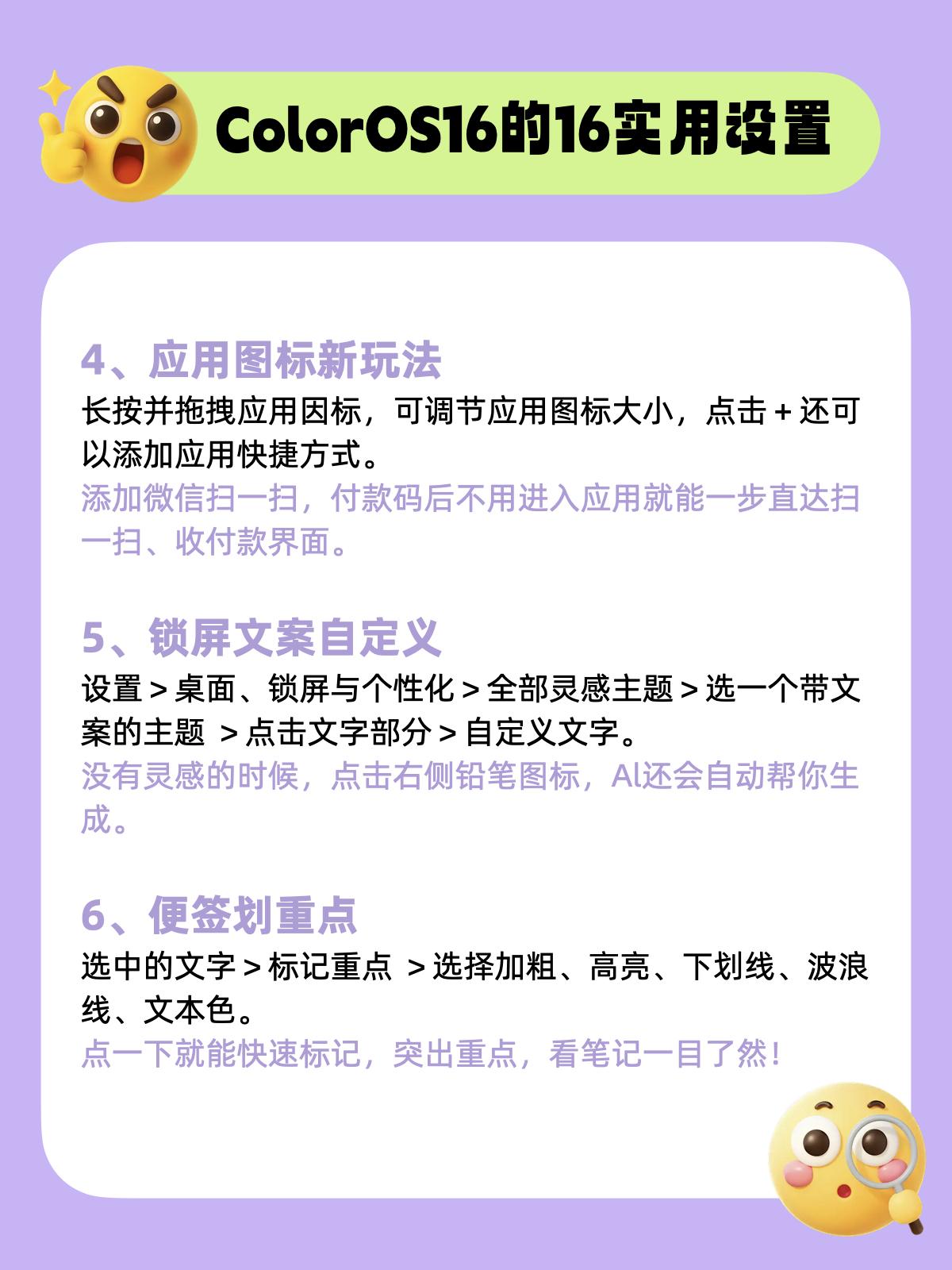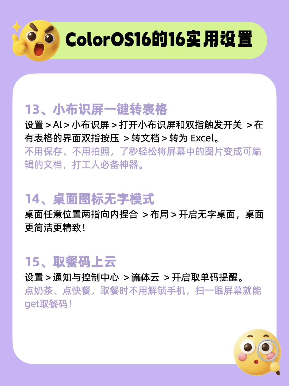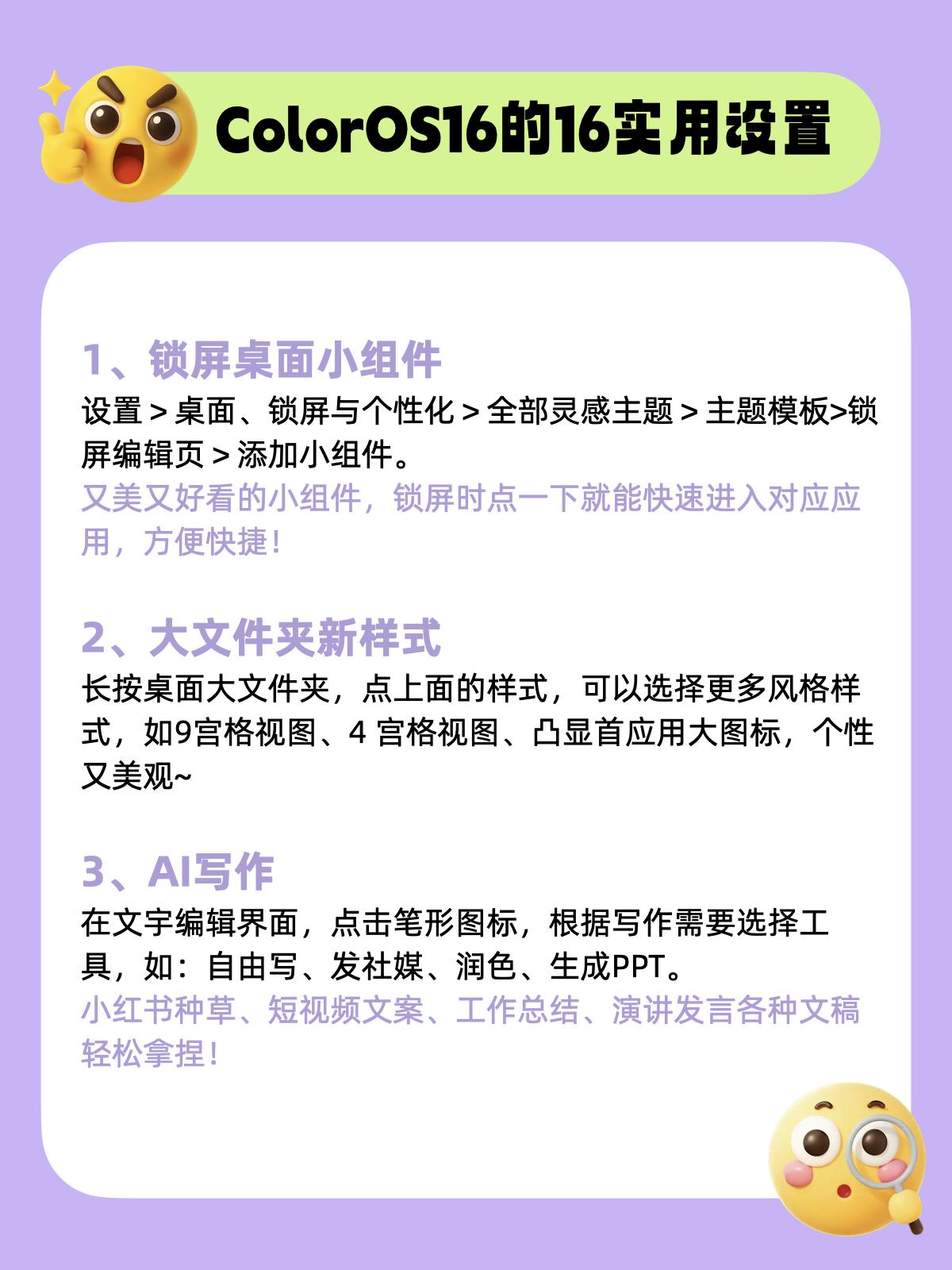 ColorOS16小技巧来了!用OPPO手机的快试试 📱OPPO老粉报到! 这个月刚换的Find X9 Pro 到手后就把ColorOS 16摸透了 💪今天就分享我在网上学的【ColorOS 16 实用设置】 ❗️设置技巧都放图里啦,跟着操作就能用❗️ 每个都是贼实用的功能设置! 🌟用OPPO的姐妹快去试试~ 尤其是下面这几个,是我超爱的功能👇 📝AI写作助手 🔧文字编辑界面>点击笔形图标 然后根据写作需要选择自由写、发社媒、润色、生成PPT等工具 我没灵感的时候经常用AI写作帮我写短视频文案 输入关键词就自动生成大纲,逻辑清晰还支持改写,各种文稿轻松拿捏~ 📱小布识屏一键转表格 🔧设置>AI>小布识屏>打开小布识屏和双指触发开关>在有表格的界面双指按压 >转文档>转为 Excel 看文件的时候遇到价格表或数据,双指触发识屏 轻松将屏幕中的图片变成可编辑的文档 上周做项目对比,5分钟搞定数据整理,打工人必备~ ✨锁屏文案自定义 🔧设置>桌面、锁屏与个性化>全部灵感主题>选一个带文案的主题 >点击文字部分>自定义文字 学会这个功能之后,就很喜欢把自己喜欢的文案放上壁纸 每次解锁看到都有好心情 而且没有灵感的时候,直接点击铅笔✏️图标,AI还会自动帮你生成锁屏文案,很赞~ 玩机技巧ColorOS16机圈德芙玩机攻略OPPO Find X9