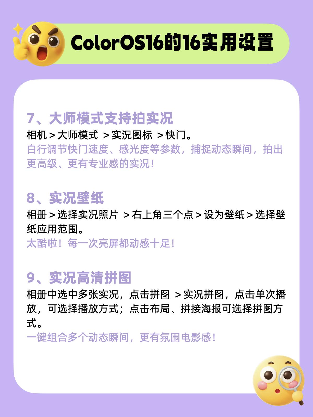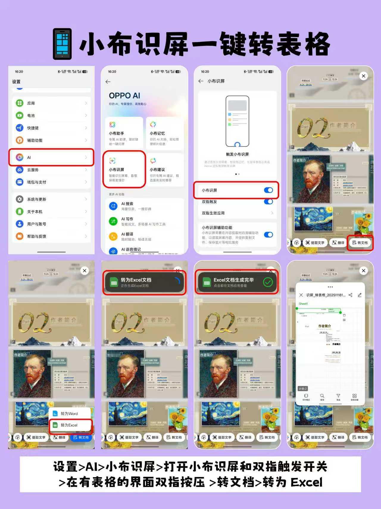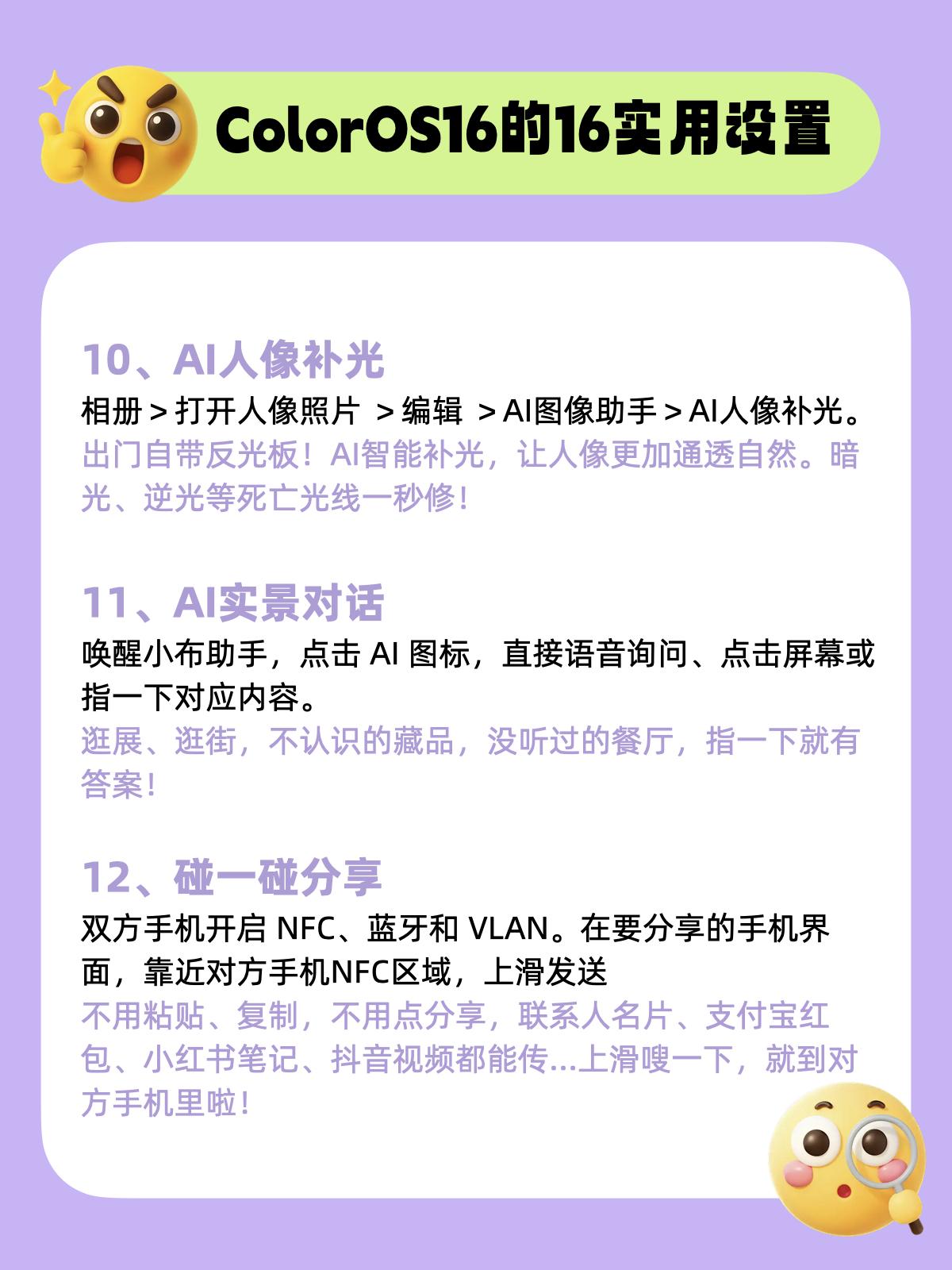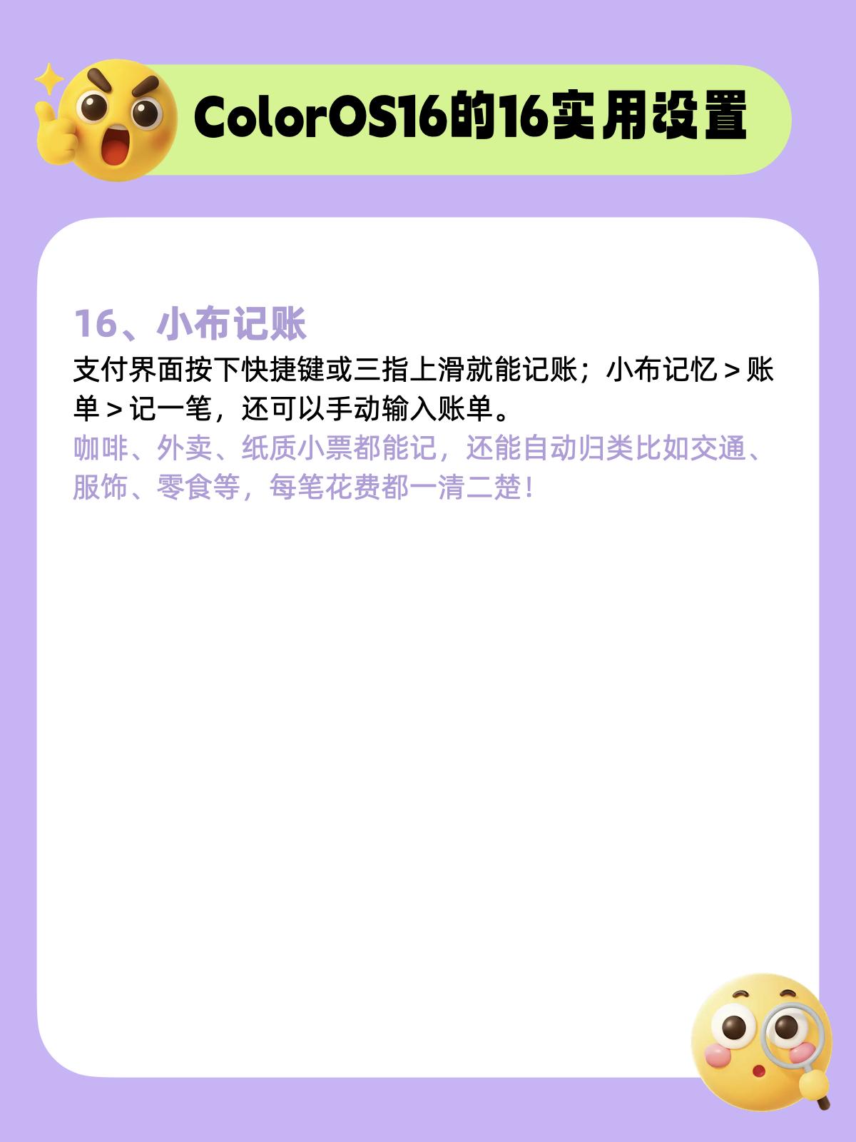 ColorOS16小技巧来了!用OPPO手机的快试试 📱OPPO老粉报到! 这个月刚换的Find X9 Pro 到手后就把ColorOS 16摸透了 💪今天就分享我在网上学的【ColorOS 16 实用设置】 ❗️设置技巧都放图里啦,跟着操作就能用❗️ 每个都是贼实用的功能设置! 🌟用OPPO的姐妹快去试试~ 尤其是下面这几个,是我超爱的功能👇 📝AI写作助手 🔧文字编辑界面>点击笔形图标 然后根据写作需要选择自由写、发社媒、润色、生成PPT等工具 我没灵感的时候经常用AI写作帮我写短视频文案 输入关键词就自动生成大纲,逻辑清晰还支持改写,各种文稿轻松拿捏~ 📱小布识屏一键转表格 🔧设置>AI>小布识屏>打开小布识屏和双指触发开关>在有表格的界面双指按压 >转文档>转为 Excel 看文件的时候遇到价格表或数据,双指触发识屏 轻松将屏幕中的图片变成可编辑的文档 上周做项目对比,5分钟搞定数据整理,打工人必备~ ✨锁屏文案自定义 🔧设置>桌面、锁屏与个性化>全部灵感主题>选一个带文案的主题 >点击文字部分>自定义文字 学会这个功能之后,就很喜欢把自己喜欢的文案放上壁纸 每次解锁看到都有好心情 而且没有灵感的时候,直接点击铅笔✏️图标,AI还会自动帮你生成锁屏文案,很赞~ 玩机技巧ColorOS16机圈德芙玩机攻略OPPO Find X9