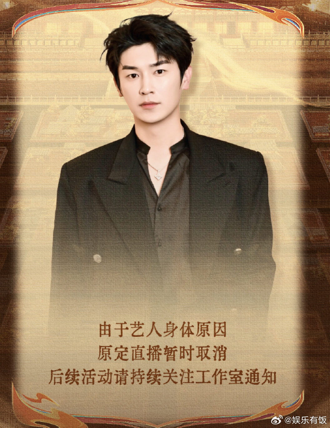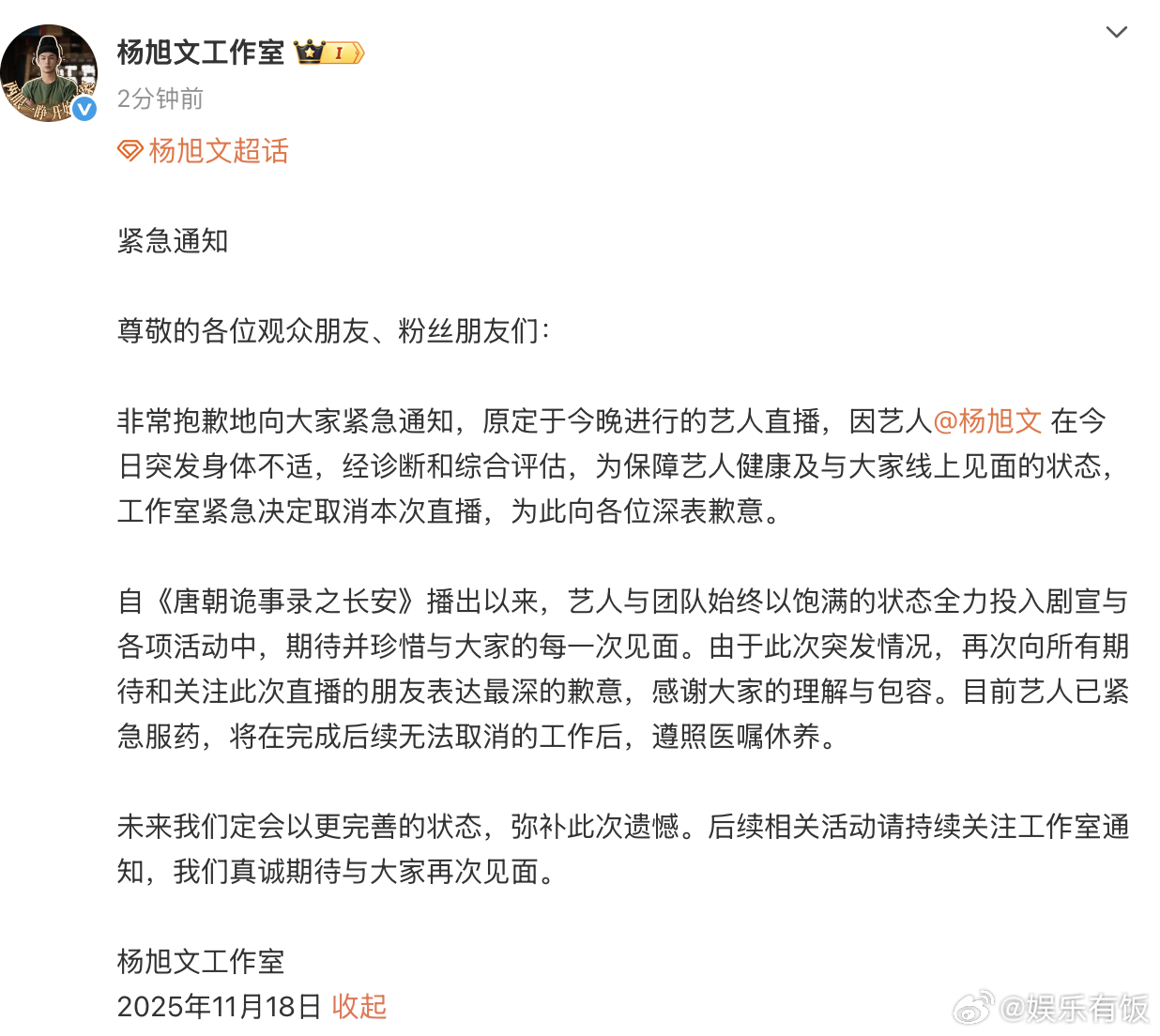 18 日, 发布紧急通知,宣布因艺人杨旭文突发身体不适,原定于当晚进行的直播活动正式取消。通知中,杨旭文工作室向观众及粉丝深表歉意,称经诊断和综合评估,为保障艺人健康及线上见面状态,不得不做出取消决定。同时透露,杨旭文目前已紧急服药,将在完成后续无法取消的工作后遵照医嘱休养。