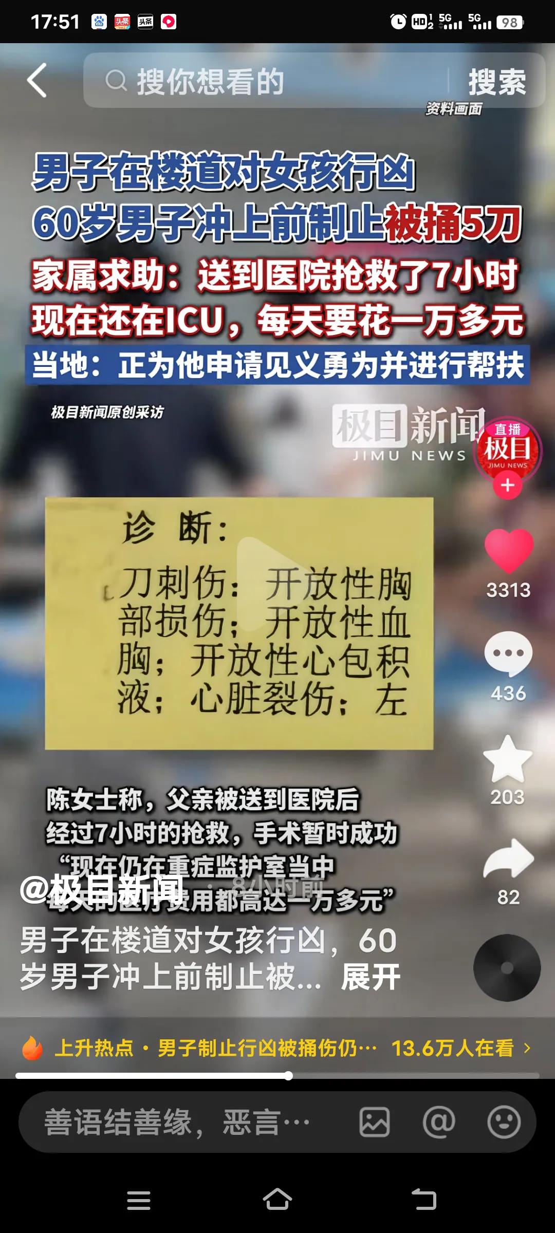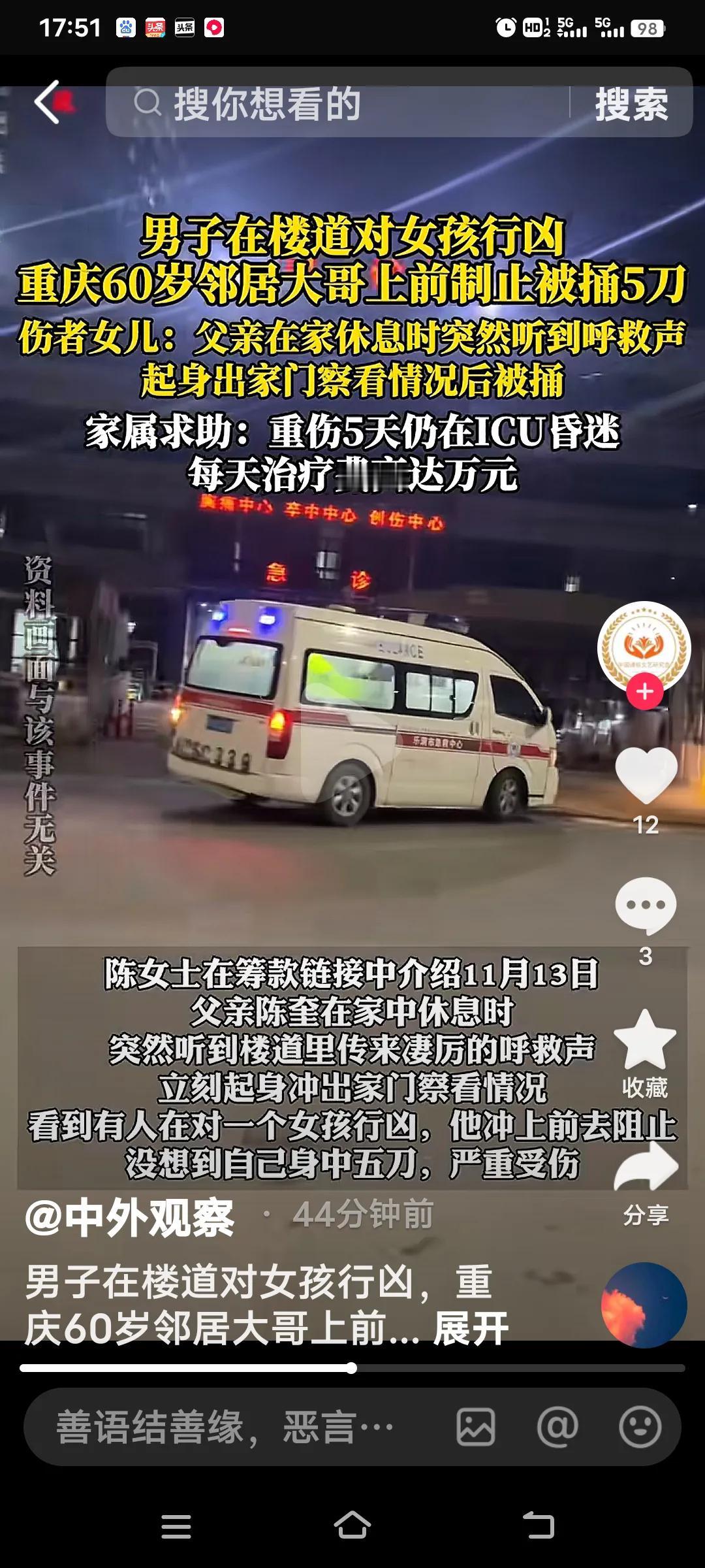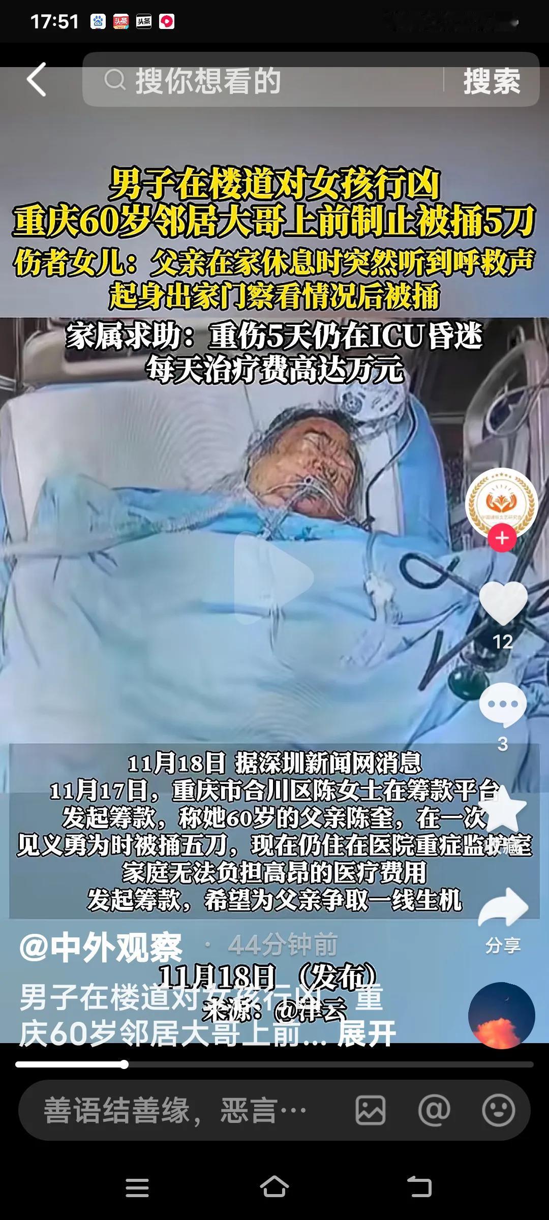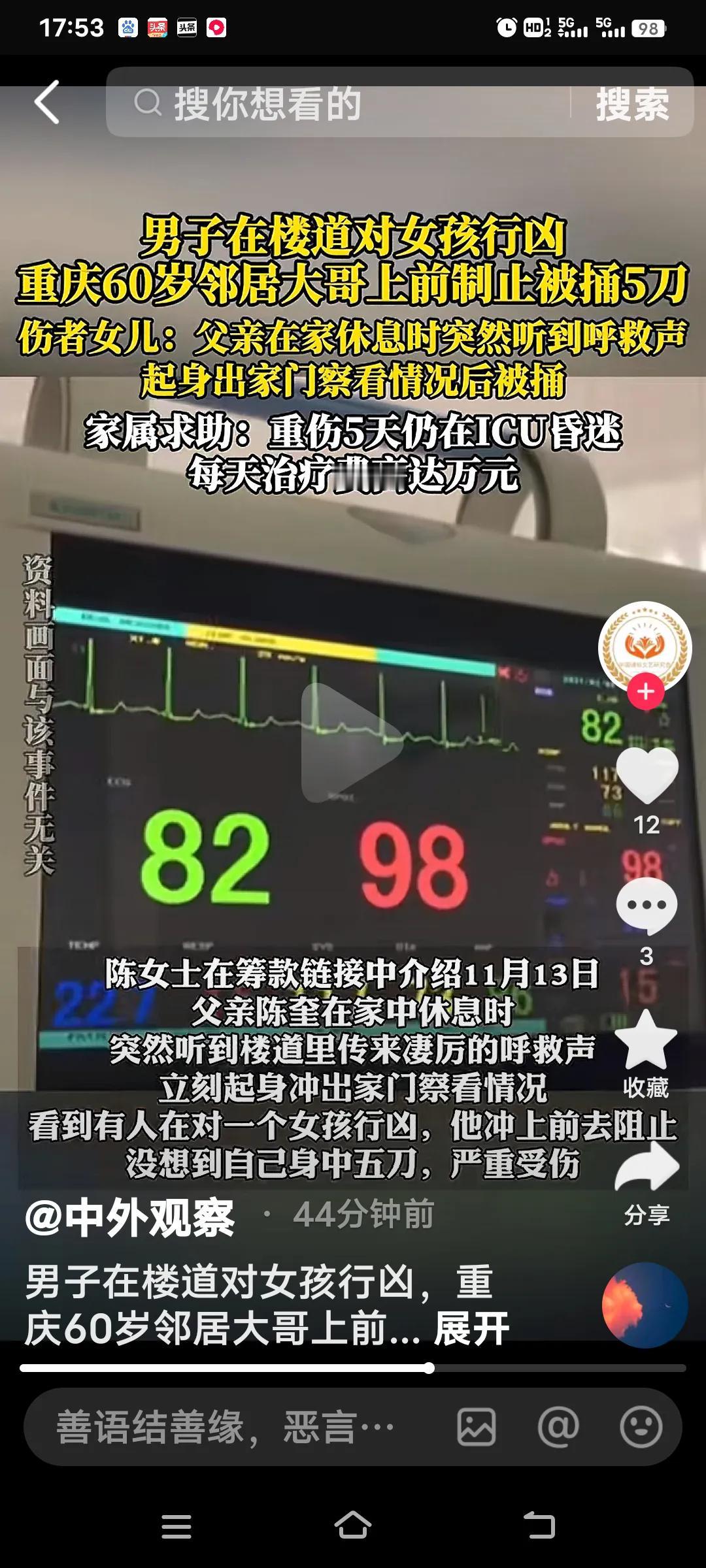 重庆60岁的陈奎老人太让人敬佩了!11月13日,他在家听到楼道女孩呼救,毫不犹豫冲出去制止行凶者,结果身中5刀。女儿接到电话后赶紧联系物业并叫了120,老人被送到合川区人民医院,经7小时抢救暂时脱离危险,送进了重症监护室。 诊断结果很严重,刀刺伤、开放性胸部损伤等,老人还在ICU昏迷。要命的是每天一万多的治疗费,普通家庭哪扛得住啊。11月17日,女儿只能在筹款平台求助。英雄流血又流泪,希望社会能多帮帮他,别让好人寒心! 但愿有更多的人看到,评论区里有人说了,热度顶起来。