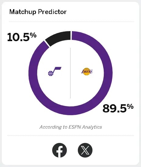 詹姆斯出战成疑!EPSN预测明天爵士vs湖人胜率:湖人89.5%,爵士10.5%