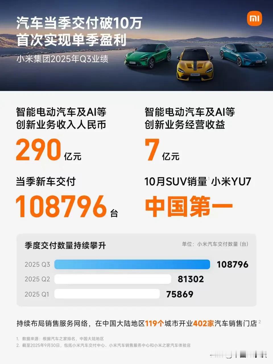 小米集团2025三季度财报来了!八个字概括:强韧增长,稳步向前。 总收入1131亿元,连续4个季度超千亿,同比增长22.3%;经调整净利润113亿元,同比增长80.9%。智能电动汽车及AI等创新业务收入290亿元,首次实现单季盈利。 “人车家全生态”深度融合,三大主业均保持稳健增长。智能手机全球出货量4330万台,连续9个季度同比增长;IoT业务收入276亿元,连续7个季度同比增长;互联网业务收入94亿元,创下历史新高。 智能电动汽车及AI等创新业务加速成长,当季新车交付108796台,小米YU7位居10月国内SUV车型销量第一。