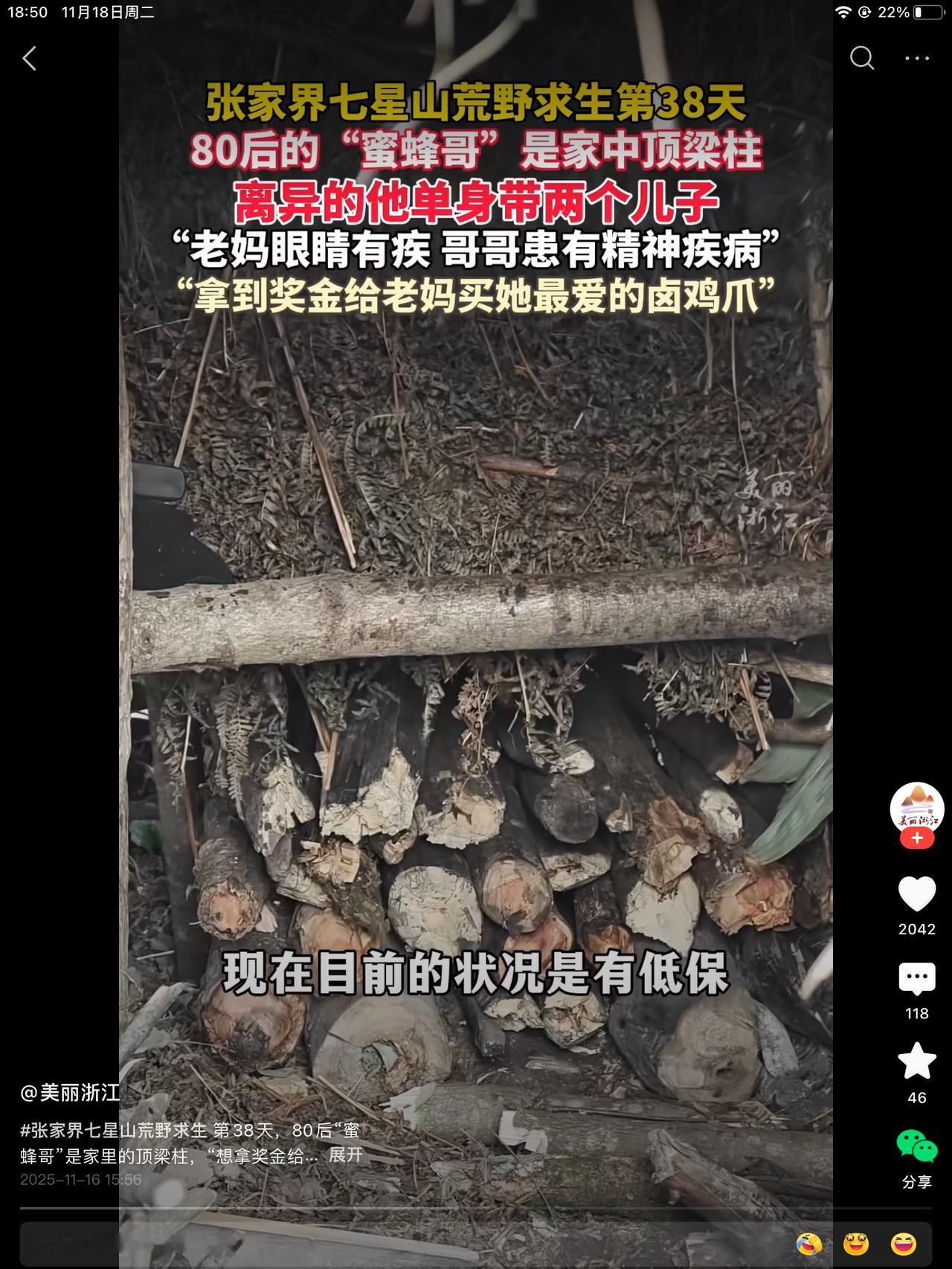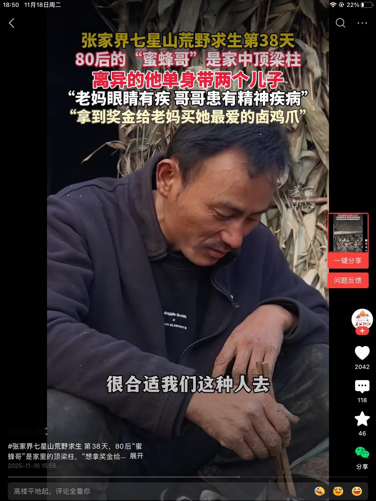 荒野求生蜜蜂哥,家里吃低保,妈妈眼睛有残疾,哥哥精神有残疾,爸爸去年过世。自己两个儿子,离异。他说荒野求生,很适合他这种人去。 眼泪不争气的流了下来。翻译过来就是,生活很苦,跟流浪汉似的。荒野求生也就那样吧!能有多苦,吃就是了,又不是没吃过。进决赛的中年人,都有故事。 节目组发的鞋子不舍得穿是他吧?留给儿子穿。看了真心酸。为了碎银几两,把自己饿的瓢干物卡。连盐都吃不上。 还有那个道友,能进决赛都得感谢他。把自己冻死他也不会退赛,节目组怕出人命,直通决赛了。多出点奖金也在所不辞了。不是他们多宽容,是一个景区出人命就砸了买卖。落下臭名这辈子都洗不掉。