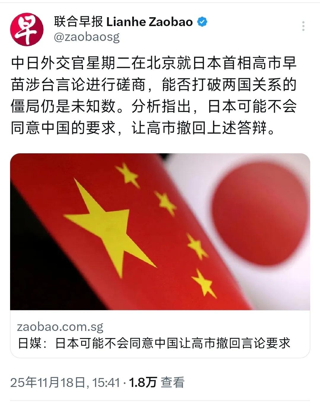 据新加坡《联合早报》报道,中日外交官针对日本首相高市早苗涉台言论展开磋商,两国关系僵局能否打破尚属未知。分析认为,日本或许不会应允中方要求,让高市撤回相关答辩。 这位局长来就是背锅而已。不愿撤回反华发言,那到底来干嘛?既然坚决不认错,那不妨把历届日本政府对华一贯的立场到底是什么,讲出来。难道都是“台湾有事,就是日本有事”?