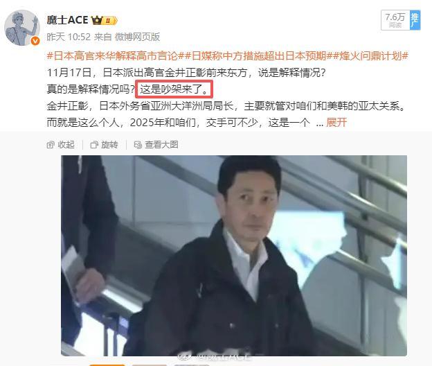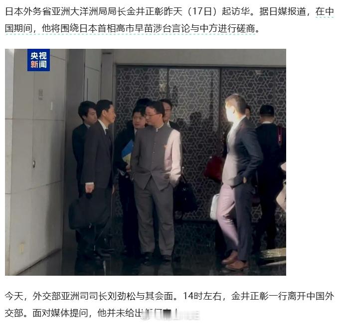 那年双手插兜,不知道谁是对手咱们司长,两手插兜,盯着日本这次因为高市早苗言论来咱们这谈判的日本外务省官员金井正彰,把金井正彰都看得局促不安,双手拧着文件包,像个被训斥的实习生。随后,金井正彰对媒体没有给出任何表态就离开了。很明显,吵了一架,没有拿到任何成果,自然无法有什么表态。这个结果,昨天它来的时候咱就说了,不用期望日本这次是来认错的,这次是来吵架的。既然是来上脸的,当然就不会给什么好果子吃了。训它们一顿,实属应该。接下来,贸易战要继续深化了。军事战争不用那么急,贸易战威力一样大。特朗普都受不了咱们的贸易一拳,小八嘎更扛不住。先用贸易战把日本打疼,打疼了,很多利益集团的利益受损,它们自己都会去找高市早苗算账。就高市早苗这么搞,现在虽然嘴硬,随着受损团体越来越多找上门,挺不了多久了。一旦低头,反攻倒算就开始了,高市早苗离辞职下台就不远了。高市早苗职业生涯倒计时——1个月!