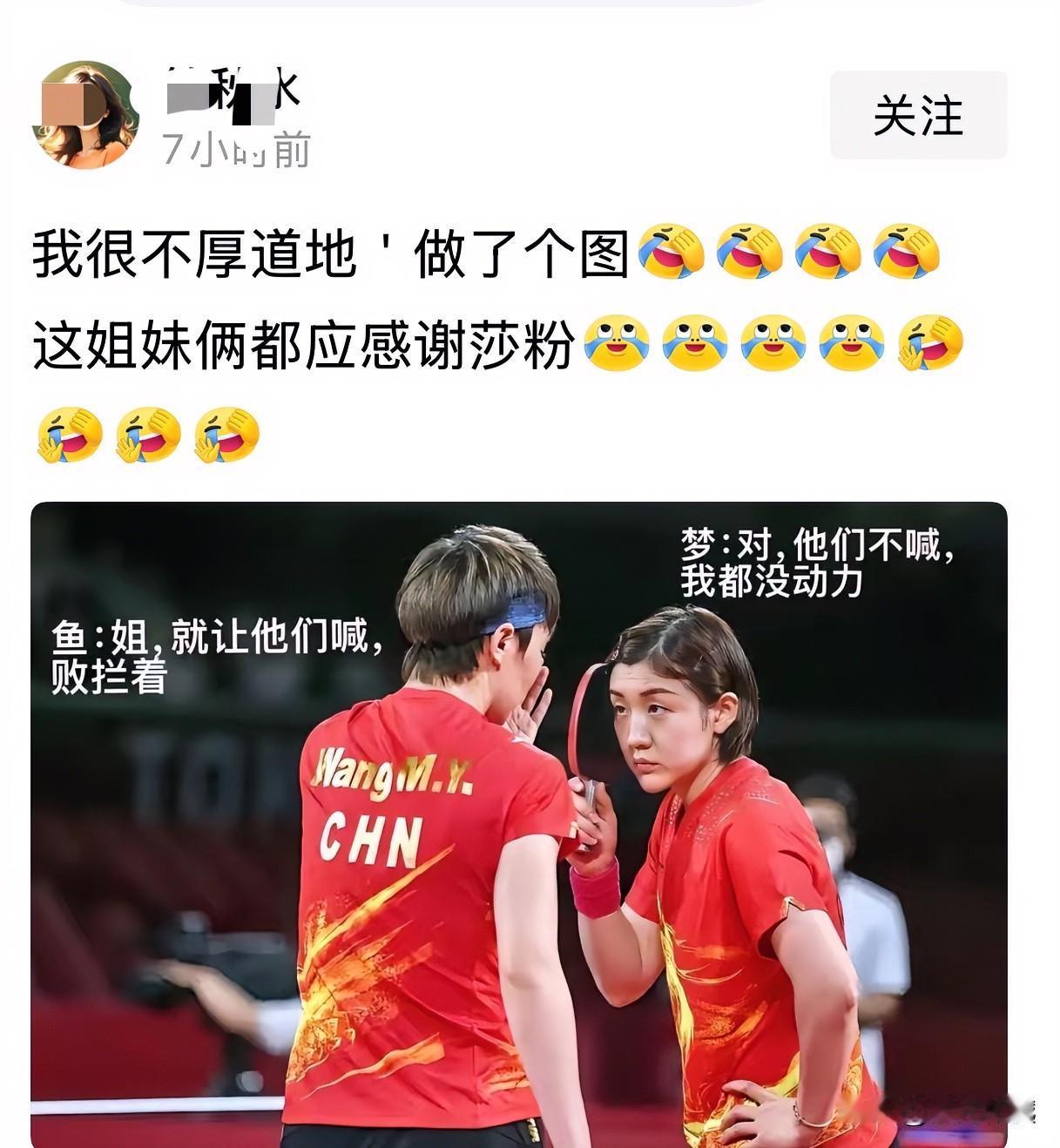 鱼(王曼昱):姐,就让他们喊,败拦着 梦(陈梦):对,他们不喊,我都没动力 乒迷们看到这幅调侃图后,心中也一定会感叹:国乒的舆论氛围,怎么会到了这个地步! 巴奥女单决赛中的陈梦,亚洲杯和全运会决赛中的王曼昱,当然还有孙颖莎被干扰的那一嗓子别遮啦,为国乒两夺奥运女团冠军的梦莎昱,都遭到了不理智粉丝们的干扰。 国乒的球迷争论,总是比队员们的比赛激烈,捧一个贬一个的不礼貌举止,最终受伤的还是每一个国乒队员。