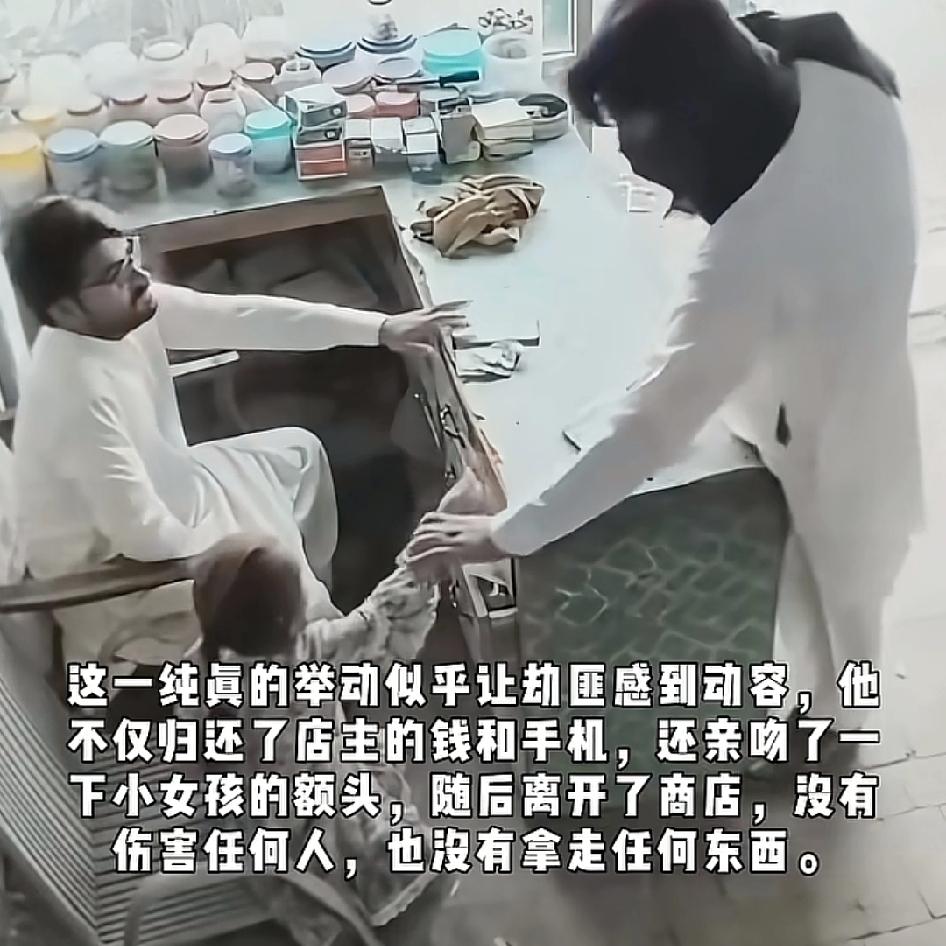 持枪男子闯进店里,威胁店主交出手机和现金,小女孩向劫匪伸出手递上手中的棒棒糖 劫匪瞬间心软,放下现金和手机,并走向小女孩亲吻她的额头。他一定也有孩子,劫匪也曾是孩童,可能触动了他不幸的童年阴影。绑匪:我抢劫是为了女儿有口饭吃,算了,你也有女儿,不抢了不抢了。 巴基斯坦小女孩的棒棒糖化解了一场抢劫!这段短短的视频触动了无数网友,孩子的纯具有时能够穿透黑暗,带来意想不到的照暖与力量。