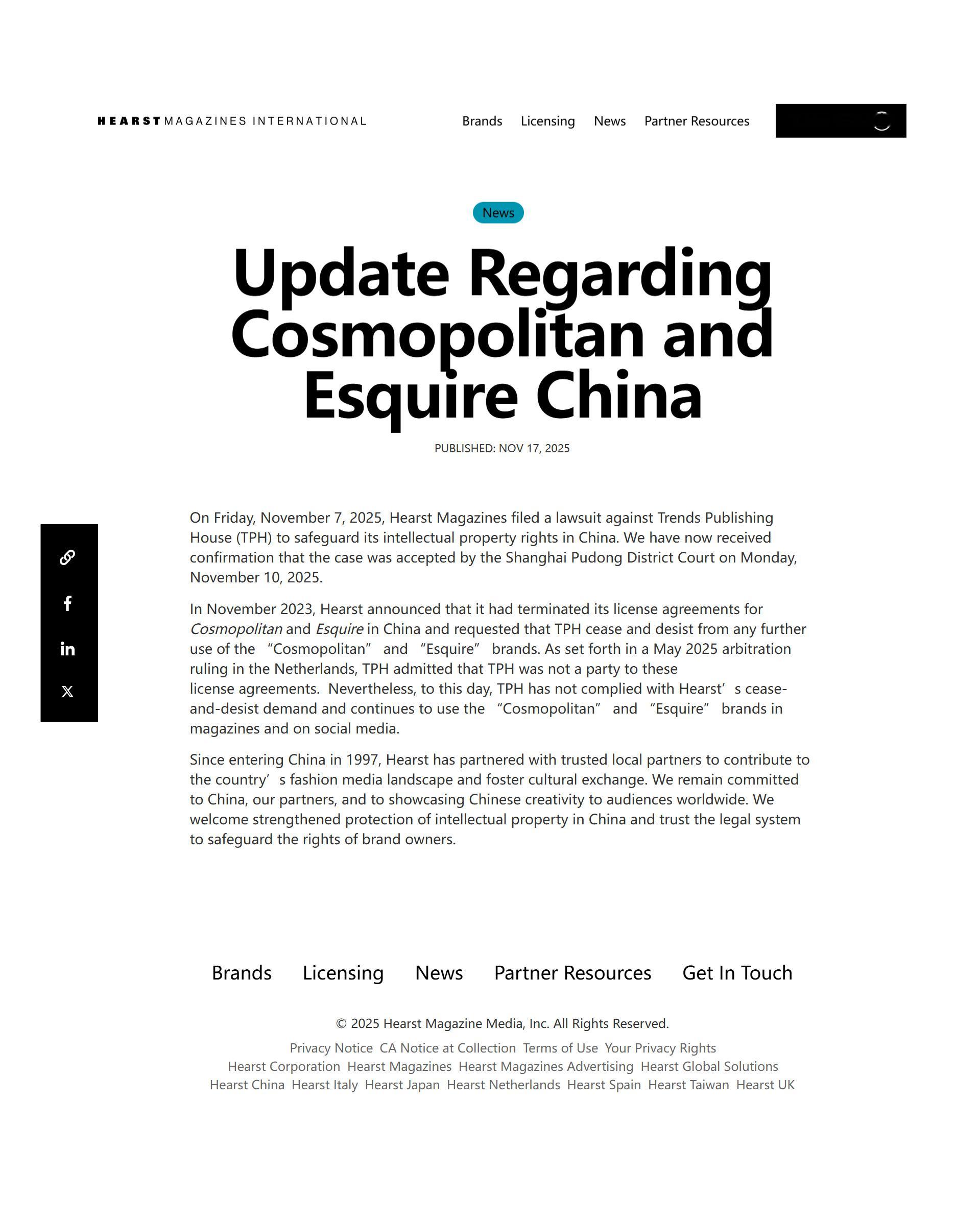 来自传媒巨头 Hearst 在官网正式发布的新闻公告 ,内容大意就是强调赫斯特集团针对内地版 Esquire 和 COSMOPOLITAN 两本刊物关于版权内容的知识产权争议目前已经在上海浦东区法院受理。文中指出 2023 年 11 月赫斯特公司已经终止其在华关于这两本刊物的授权协议 ,并于今年五月在荷兰又有了正式的仲裁裁决 ,然而 TPH (两本刊物在华的出版公司)目前仍在继续使用 ,所以针对双方的争议目前已经进一步的在国内法院正式提起诉讼 、受理 .