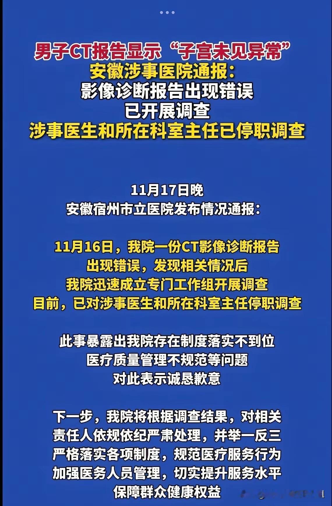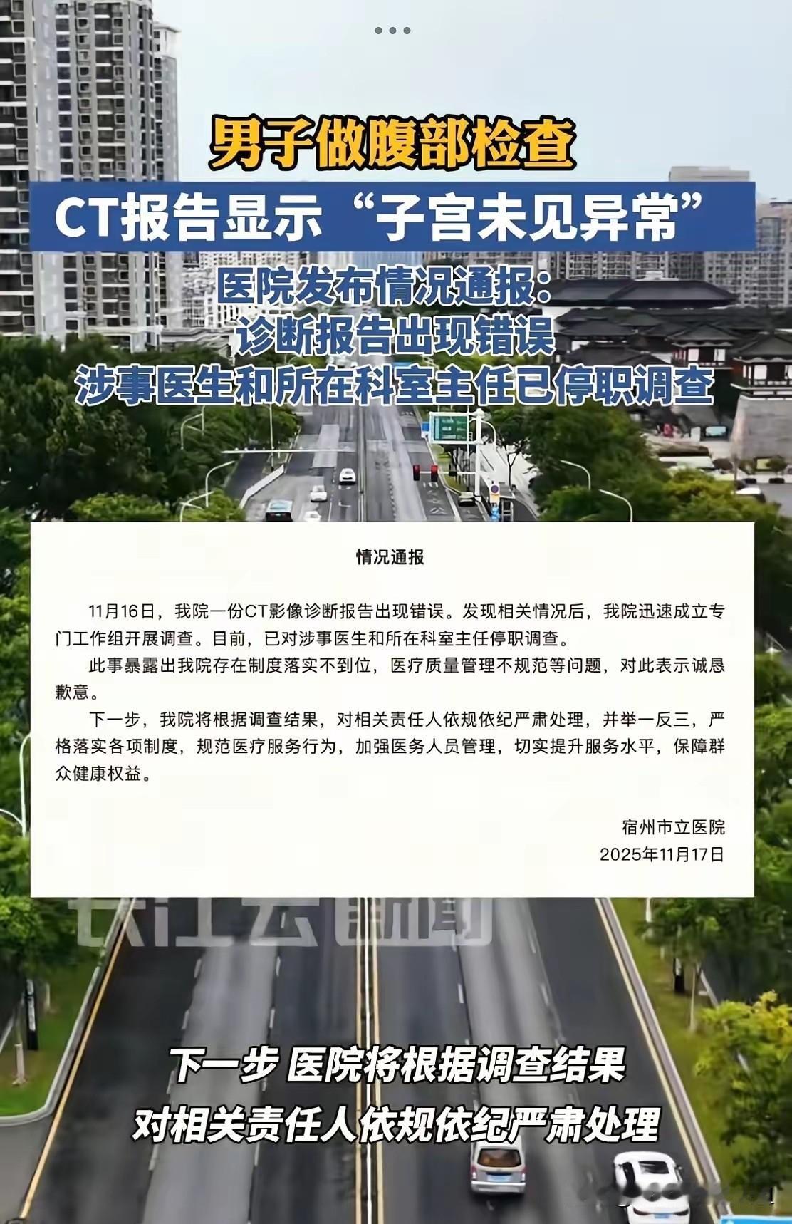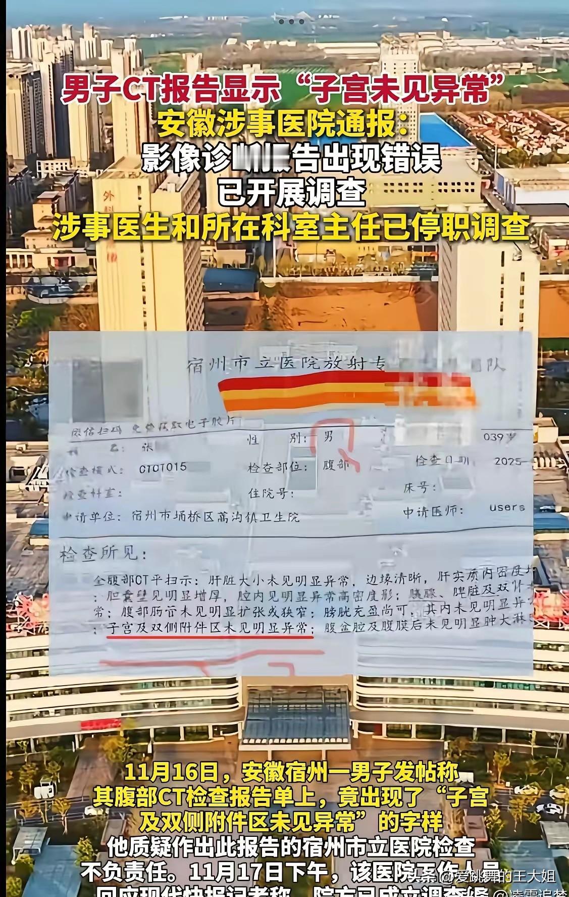 太荒唐了!”安徽宿州,一男子到医院看病,拿到ct报告单后,一下子傻眼了,不是被病情吓到了,而是报告结果赫然写着:“子 宫及双侧附件未见明显异常。”男子当既认为这份报告有假,气得当场找医院讨 说法! 这位男性患者的愤怒完全可以理解,任何一个人拿到这种基本信息都搞错的报告,难免会怀疑整个检查过程的真实性。院方后续通报确认报告出错,并将涉事医生和科室主任停职调查,承认存在“制度落实不到位,医疗质量管理不规范”的问题。但这类错误背后的根源,远不是处理几个人就能彻底解决的。 仔细看事件细节,这份问题报告竟然盖着“宿州市立医院放射专家会诊团队”的章,而且报告医师和审核医师还是同一个人。审核环节形同虚设,所谓的“专家团队”和“双重审核”在现实操作中成了摆设。更值得玩味的是,类似的荒唐事并非头一回发生。就在2023年,四川富顺县一位73岁的男性患者,同样在CT报告上看到了关于自己“子宫”的描述,当时院方的解释是“患者名字像女性,工作人员不细致”。两年间,不同省份,如出一辙的错误,这说明问题具有普遍性,医疗系统内部的质量管控存在巨大漏洞。 这次宿州的事件还有一个背景,患者的CT影像是由蒿沟镇卫生院拍摄,然后通过远程系统传给宿州市立医院的专家团队出报告。这种“基层检查、上级诊断”的模式本意是优化医疗资源,但衔接不畅、责任心缺失,反而可能放大错误。合作卫生院也因此事终止了与市立医院的合作,这对区域医疗协作是一个打击。 深层来看,这类错误暴露了一些医疗机构在追求规模扩张的同时,忽略了最基础的质量管理。宿州市立医院是当地唯一一家三级甲等综合医院,理应成为标杆。发生如此低级的失误,损害的是患者对整个医疗系统的信任。医院除了道歉和内部处理,更需要思考如何扎紧制度的篱笆,让每一份报告都经过真正负责任的核对。 各位读者你们怎么看?欢迎在评论区讨论。