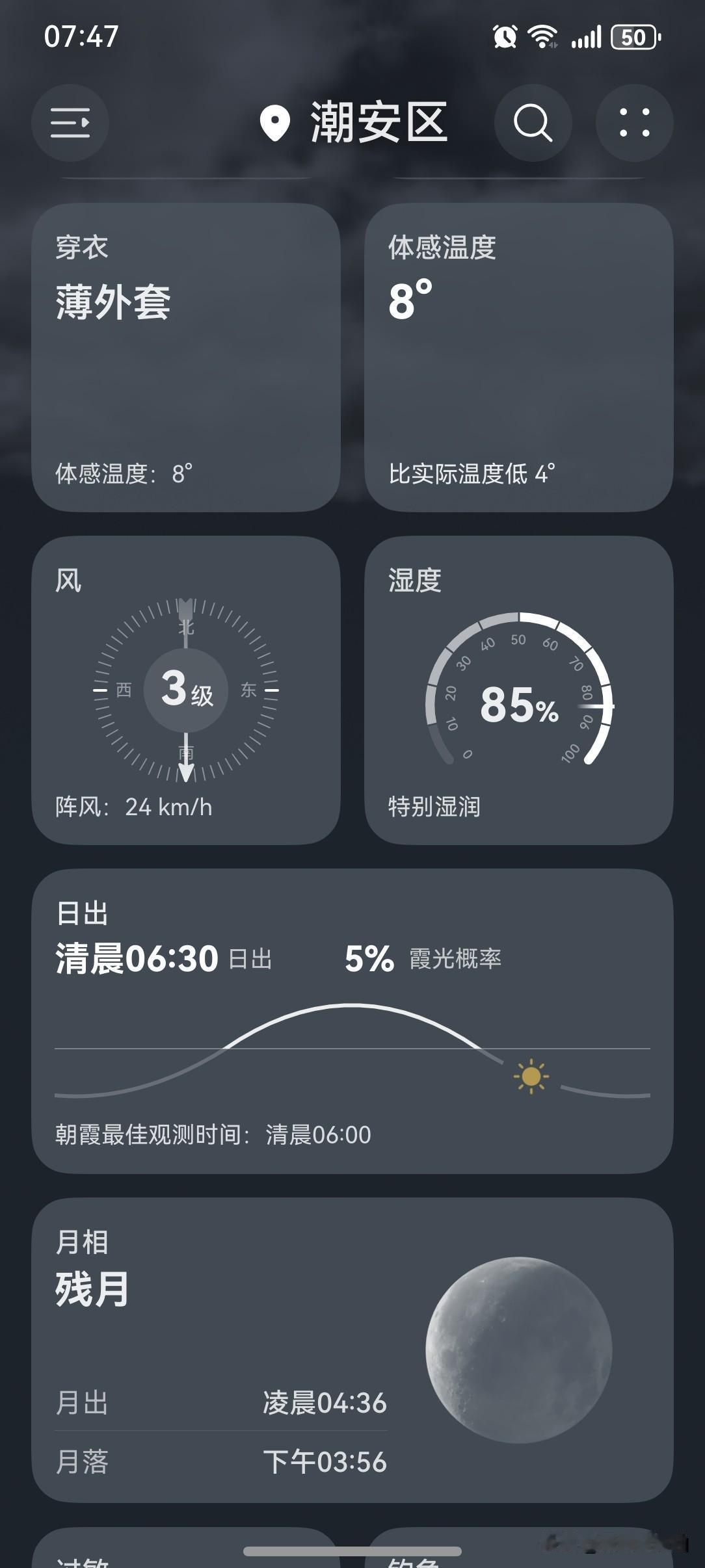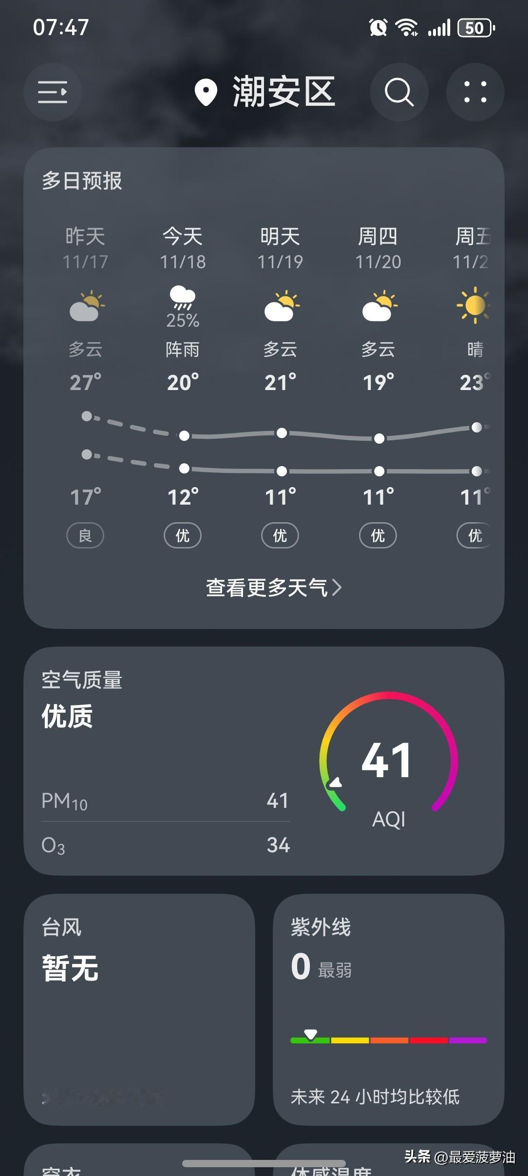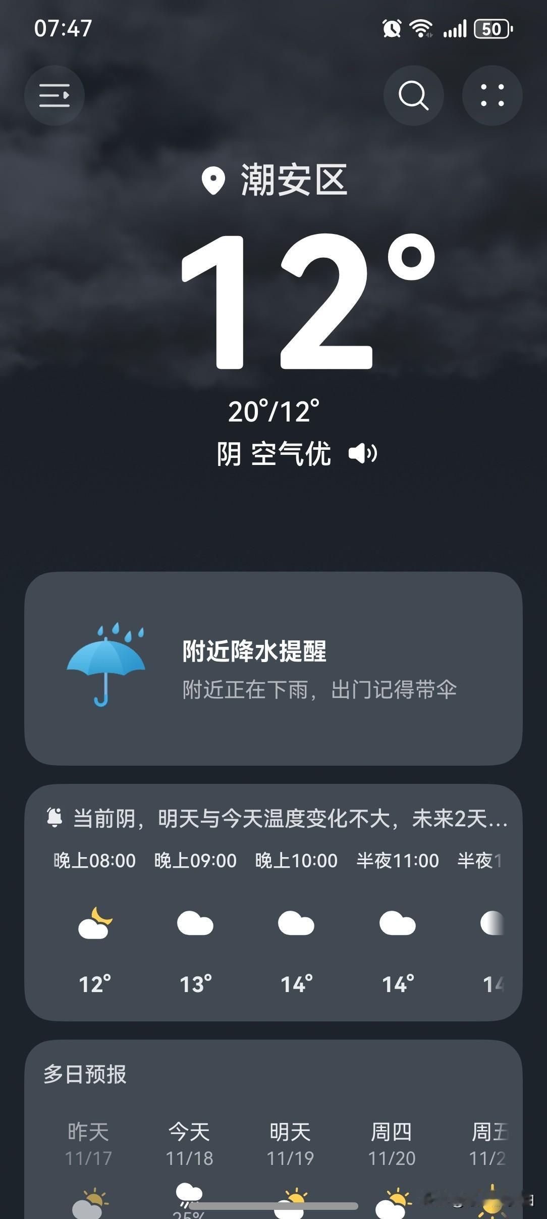 寒潮继续影响江南华南等地, 广东真的"冻"真格了, 粤北偏北气温跌至个位数! 今天(18日), 强冷空气已影响全省, 海面风力加大, 气温明显下降, 目前有一条雨带正自西向东影响华南地区, 西部已出现小雨天气。 今明(18-19日)两日, 广东阴天有小雨或零星小雨, 气温持续下降, 最低温出现在19日或20日早晨, 20日天气况逐渐转好。 今天潮州阴天, 气温11~20℃。 虽然寒冷黄色预警信息正在生效中, 但是白天温度还好, 没有感受到寒冷。 用相机记录了一下今天的天气变化, 从上午到傍晚, 除了云量较多, 总体来讲天气还是不错的, 中午有一段时间甚至可见阳光。 傍晚开始, 气温将会逐渐下降。 寒潮抵达华南, 广东迎来气温大跳水, 小伙伴们需要注意防寒保暖! “突然降温的穿衣方法”关键词冲上热搜! 三明治穿衣法必须get起来, 避免受寒冷之苦, 暖暖过冬!