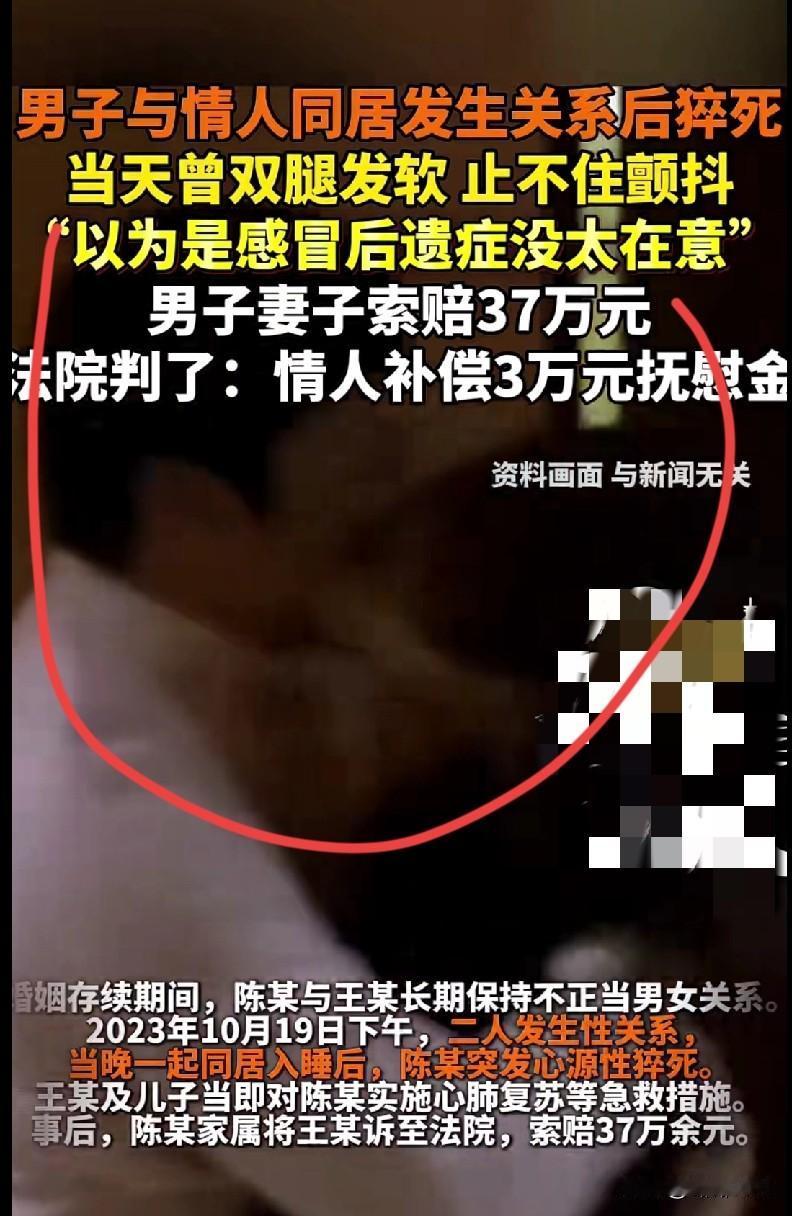 这事儿看得人直摇头——已婚男和情人同居,发生关系后猝死,老婆索赔37万,最后法院判情人补3万抚慰金。 先不说别的,这男的当天都双腿发软、止不住抖了,还当是感冒后遗症不当回事,真拿自己身体开玩笑;一边占着婚姻,一边搞婚外情,最后把命搭进去,坑了老婆也坑了情人。 老婆这边,好好的家散了,索赔也是情理之中;情人更冤,本来关系就不道德,最后还要赔一笔钱,落得一身骂名。 这事儿就是活生生的教训:婚姻里别瞎搞,对自己对别人都是坑;身体不对劲别硬扛,该看医生就看医生,命比啥都重要。