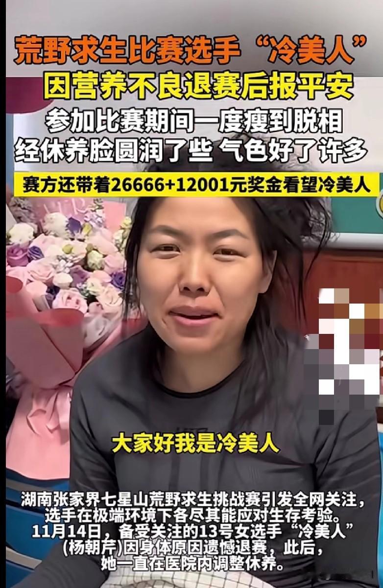 看“冷美人”报平安这状态,终于松了口气! 之前看她在荒野求生里瘦到脱相,脸都凹进去了,现在休养后圆润不少,气色明显好起来了——这才是活生生的人该有的样子啊! 荒野求生看着刺激,但真把人扔极端环境里,饿肚子、熬身体,哪是普通人扛得住的?她因为营养不良退赛不丢人,命和健康才是最值钱的。 赛方拎着快4万的奖金来看她,也算有点人情味。咱就是说,不管啥比赛,别拿身体硬扛,赢了比赛输了健康,那才是真亏。 希望她好好养着,也提醒想尝试这类挑战的朋友:野外用命换刺激,真不值当!
