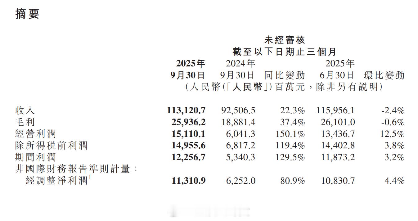 小米集团公布第三季度营收为1,131.2亿元人民币,同比增长22.3%,预估1,125亿元人民币;经调整净利润为人民币113亿元,创历史新高,同比增长80.9%