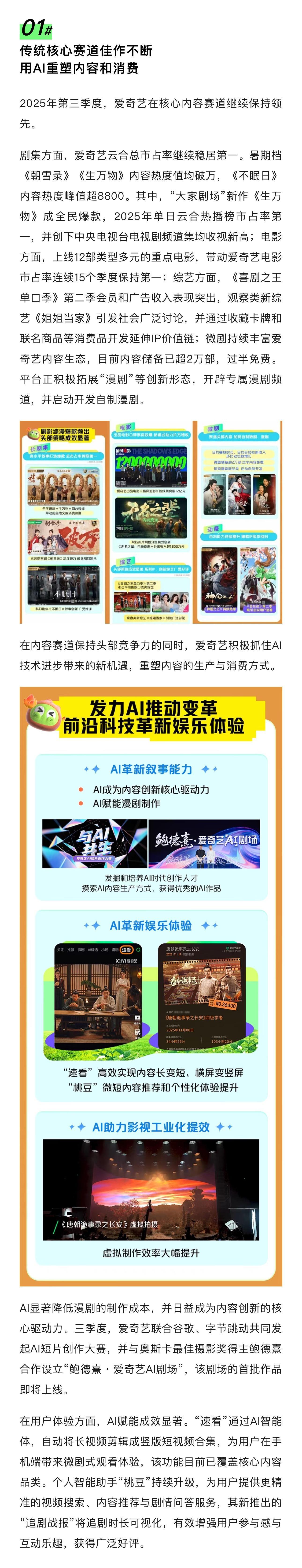 爱奇艺2025Q3财报:当季总营收66.8亿元①会员营收42.1亿元②在线广告营收12.4亿元③本季度内容发行收入6.4亿元④其他收入5.9亿元《生万物》网台双爆,成全民爆款,2025年单日云合热播榜市占率第一,并创下央八集均收视新高;暑期档《朝雪录》《生万物》内容热度值均破万,《不眠日》内容热度峰值超8800;《生万物》《朝雪录》带动会员收入,《赴山海》合作推出定制会员卡,带动会员收入;《朝雪录》《不眠日》《赴山海》带动超点;《赴山海》《生万物》带动品牌广告收入;泰语版《朝雪录》播放时长和收入峰值均刷新了爱奇艺国际版泰语配音剧集纪录,并登顶13个市场热度榜;头部内容《赴山海》授权合作商家超30个,创授权业务新纪录。