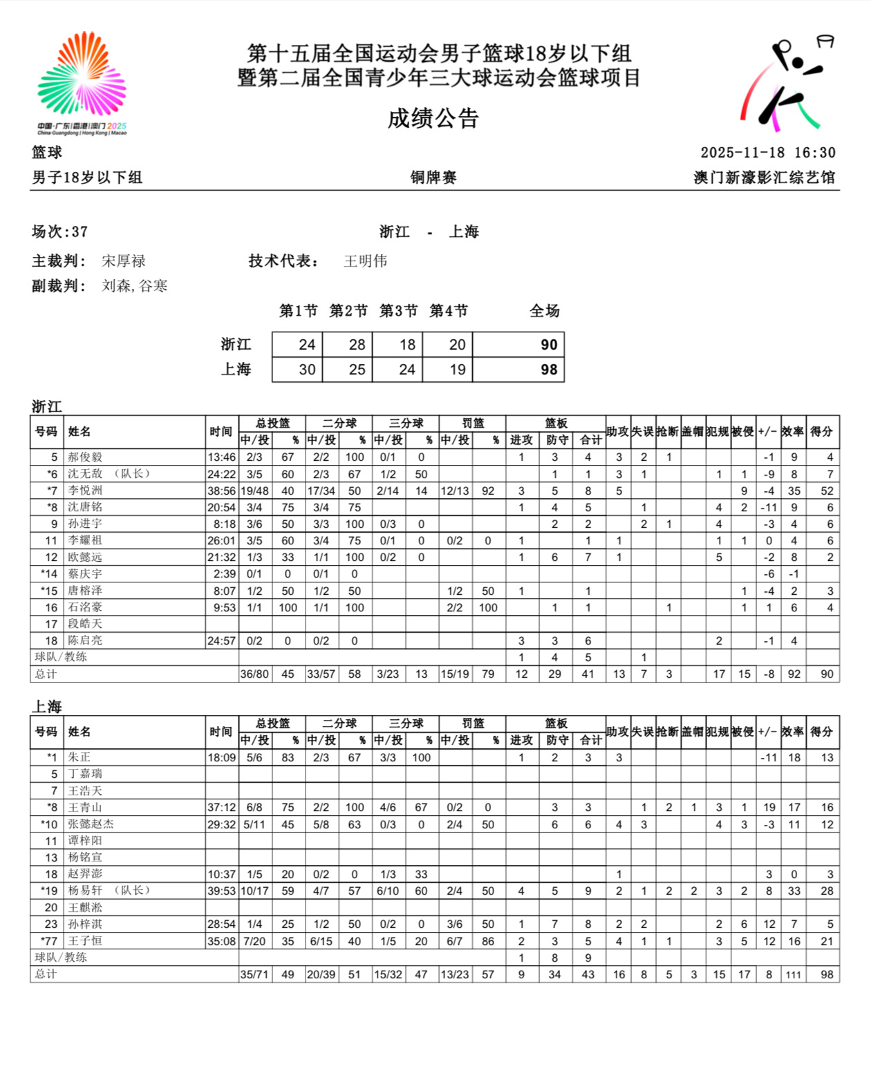上海U18战胜浙江拿到本届赛事的季军,队长杨易轩砍下28+9,不过对面有个更狠的,李悦洲52分!