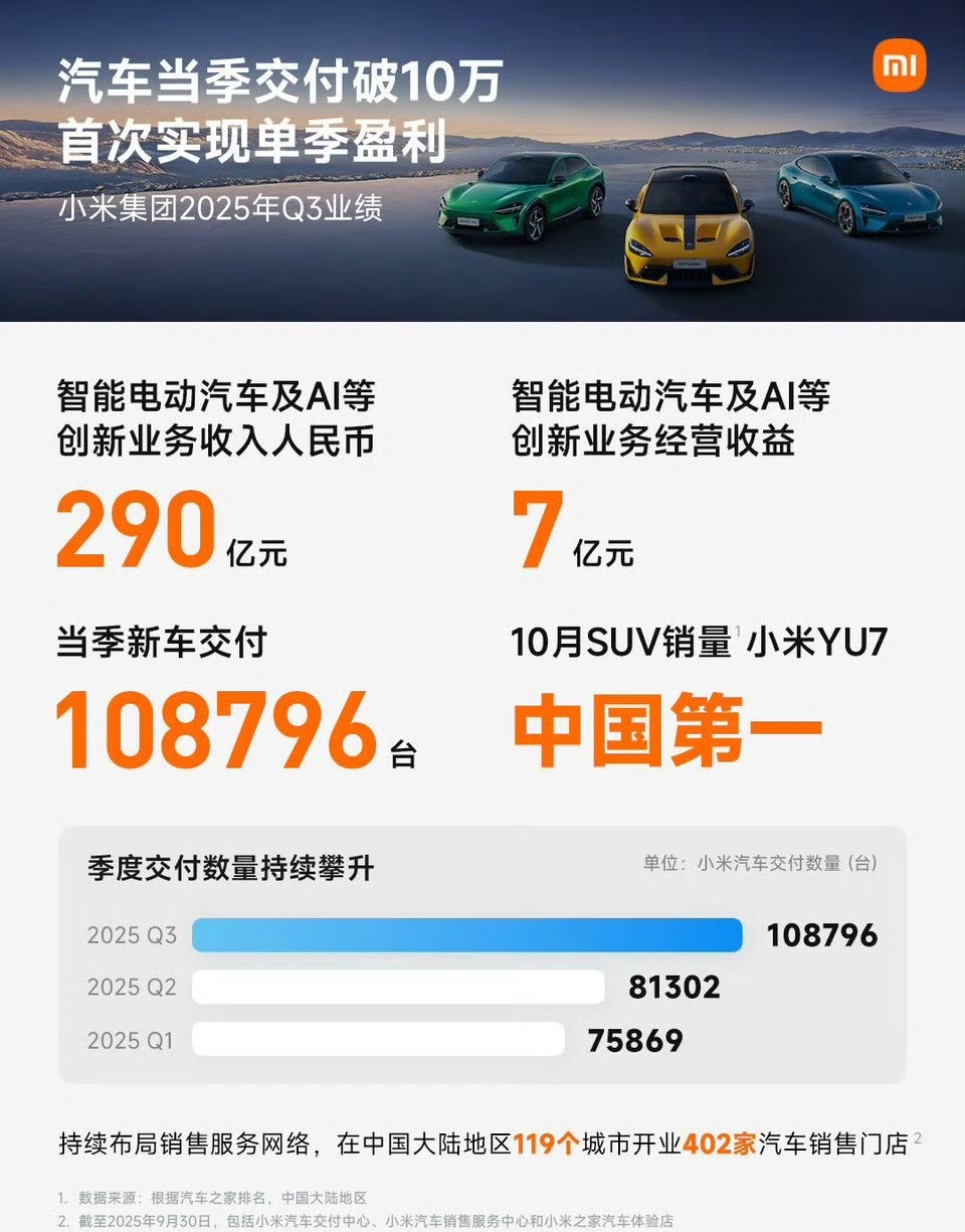 小米今天发布的Q3财报有一个很重要的消息,小米智能电动汽车及AI等创新业务收入290亿元,首次实现了单季盈利,季度交付也破了十万。要知道有些新势力搞了好些年都还在亏损,但小米入局汽车仅一年半。