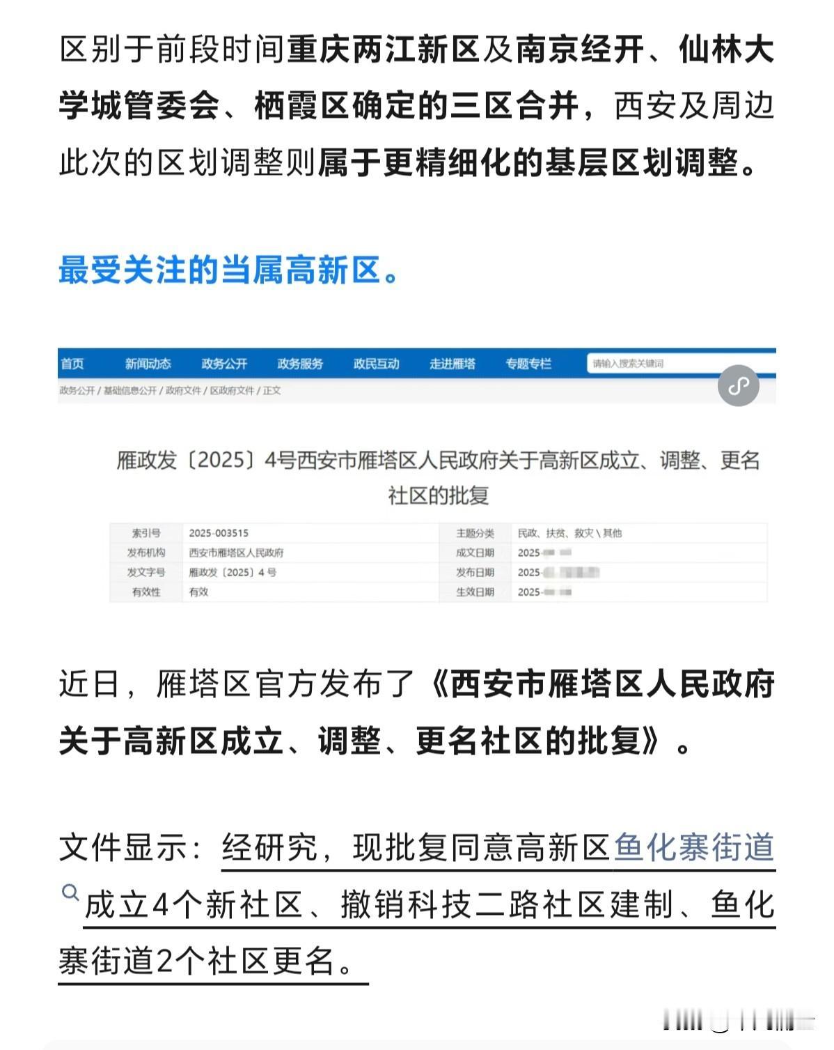 就是雁塔区关于高新区社区成立、调整、更名的批复,就能让有些人和重庆两江新区成立扯上关系,还要冠以“西安区划大调整”的噱头,这也太夸张,真是有些把网友们当小白鼠,可以任意忽悠了吧! 雁塔区关于高新区几个社区的成立、调整和更名的批复,无非是高新区属于开发区,虽然对社区实行具体管理,但涉及社区成立、调整和更名这些基层行政区划调整必须通过行政区,而开发区没有这个权限而已。社区作为最小的社会治理单元,它的变化和一般不会引起社会太大的反应。而关以“西安区划大调整”也有些言过其实了吧!当然,也希望西安通过行政区和开发区合并,像重庆两江新区和南京栖霞区和开发区合并一样做强地方经济,但这需要更高层面的决策,真不是几个社区调整能扯上关系的。所以,这类有些夸张的文章标题,让人感觉很不好,大家认为呢!