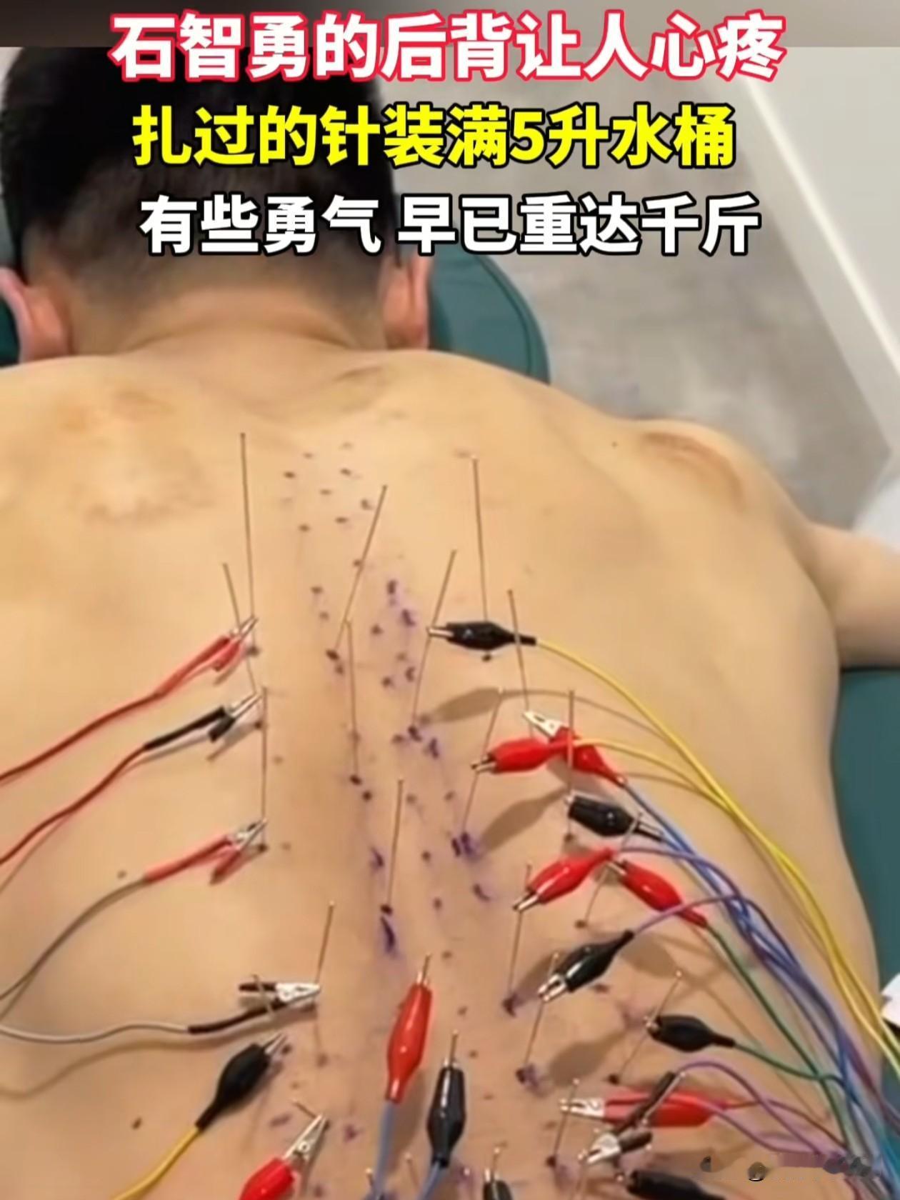 【🏅每一克重量,都是千针之痛|石智勇用伤痕铸就传奇】 当石智勇在第十五届全运会再次举起346公斤的总重量,没有人看见他转身时背后的秘密——那些密密麻麻的针眼,足以装满整整一个5升的水桶。 这是他的另一枚“勋章”。 在抓举161公斤、挺举185公斤的每一个动作背后,是无数个被针灸、拔罐、理疗填满的日夜。当常人被一针刺痛就会退缩时,他的后背却承载着成千上万针的累积。 “有些勇气,早已重达千斤。” 这句旁白,说的不只是杠铃的重量,更是他带着满身伤痕依然选择站上赛场的决心。赛后他亲吻的不仅是杠铃,更是告别那个被千万次治疗支撑起的身体。 他举起的不仅是钢铁, 更是无数次想放弃却又咬牙坚持的日日夜夜。 石智勇