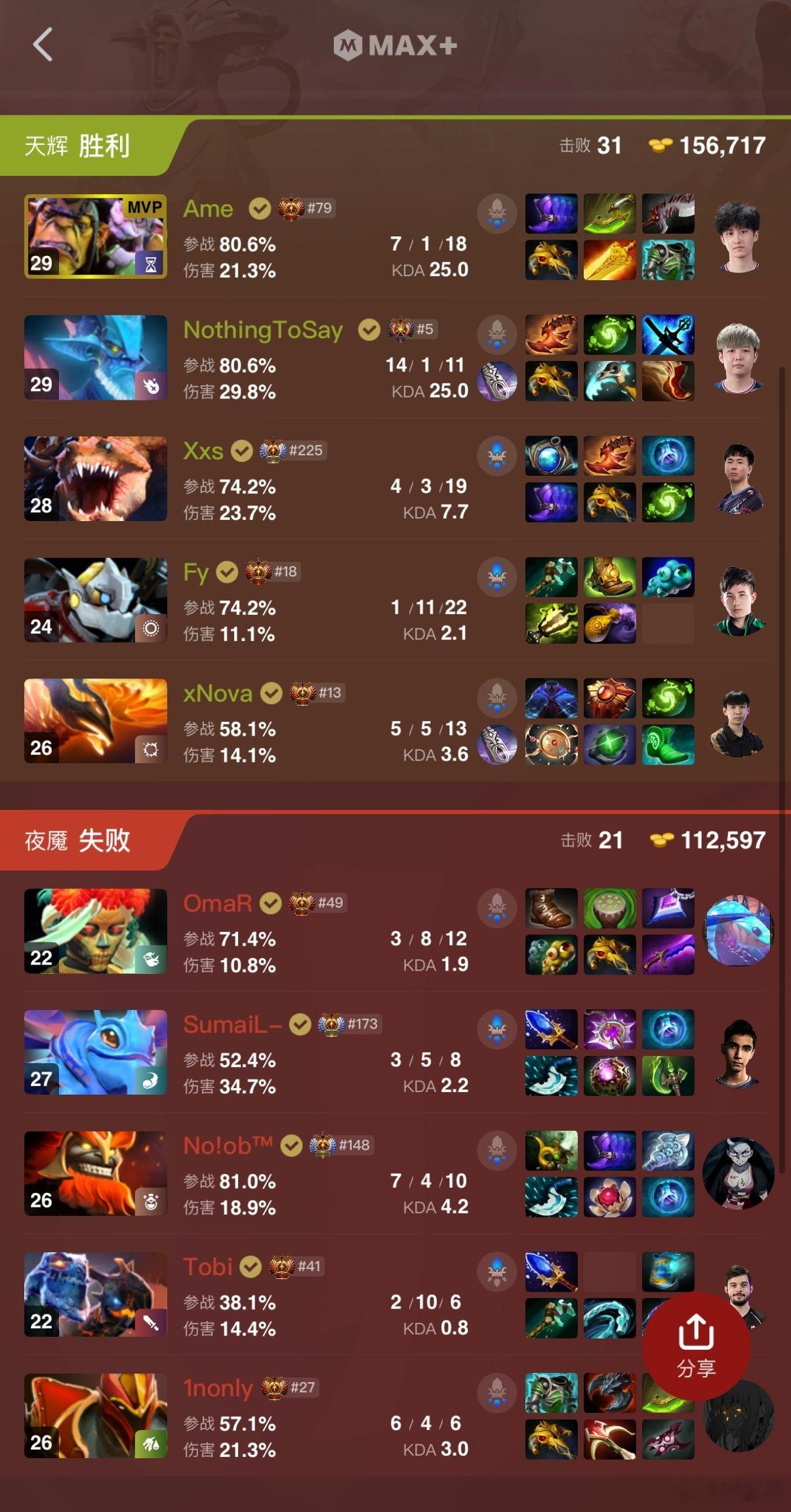 赛后评分,Xnova最高,Ame最低,Ame这把不仅多次走位失误,这个出装也是有