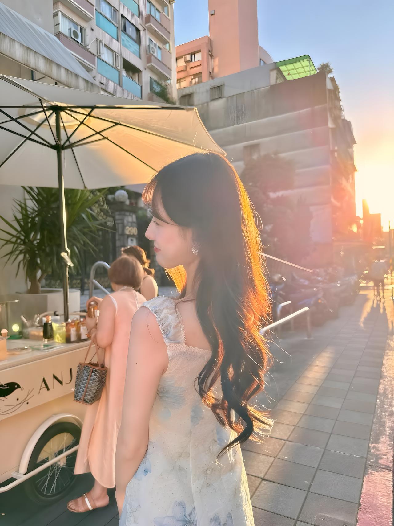 《阳光里的邂逅》 在"Swallow Market"蓝白相间的招牌下,她像朵会走路的铃兰。白色蕾丝吊带裙缀满淡粉花卉,阳光穿透镂空花纹,在她锁骨处投下细碎光斑。棕色长发被微风撩起几缕,发梢扫过肩带时,惊醒了沉睡在蕾丝里的春日。 她右手搭成凉棚,睫毛在脸颊投下扇形阴影。这个动作让腕间的银色手链轻轻摇晃,链坠是个迷你咖啡杯造型,与身后"Oshi Cafe"的招牌遥相呼应。裙摆被风掀起恰到好处的弧度,露出脚踝处系着的珍珠链,每颗珠子都像凝固的月光。 模糊的行人化作流动的色块,红T恤的男孩骑着单车掠过,带起的气流惊飞了裙角的蝴蝶结。玻璃橱窗映出她微笑的侧影,与展示柜里的马卡龙塔形成奇妙的重影。甜品师正在给蛋糕裱花,奶油枪的簌簌声混着咖啡机的轰鸣,调制出都市特有的背景音。 "Swallow Market"的遮阳棚投下菱形光斑,她站在明暗交界处,蕾丝裙摆上的花朵在光影中时隐时现。对面面包店飘来刚出炉的可颂香气,混着咖啡豆的焦香,在她周围织成无形的网。有鸽子扑棱棱掠过,翅膀搅动空气的瞬间,她耳畔的碎钻耳钉突然迸发出星芒。 阳光在"Oshi Cafe"的玻璃幕墙上流淌,倒映出蓝天白云和她的剪影。这个瞬间,整条街都成了她的背景板,连风都放轻脚步,怕惊扰了蕾丝花瓣上颤动的露珠。