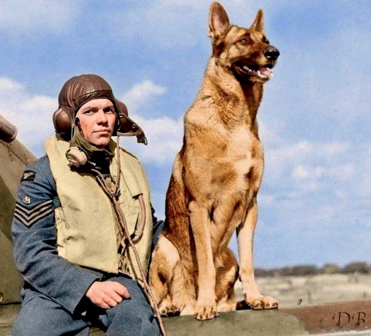 1940年9月,英国皇家空军第19中队驻地杜克斯福德。 坐在Mk I喷火“WZ-L”左侧机翼上的是飞行员乔治·塞西尔·“暴躁鬼”·温温中士,旁边趴着中队吉祥物“闪电”。 照片已由DB手工上色。