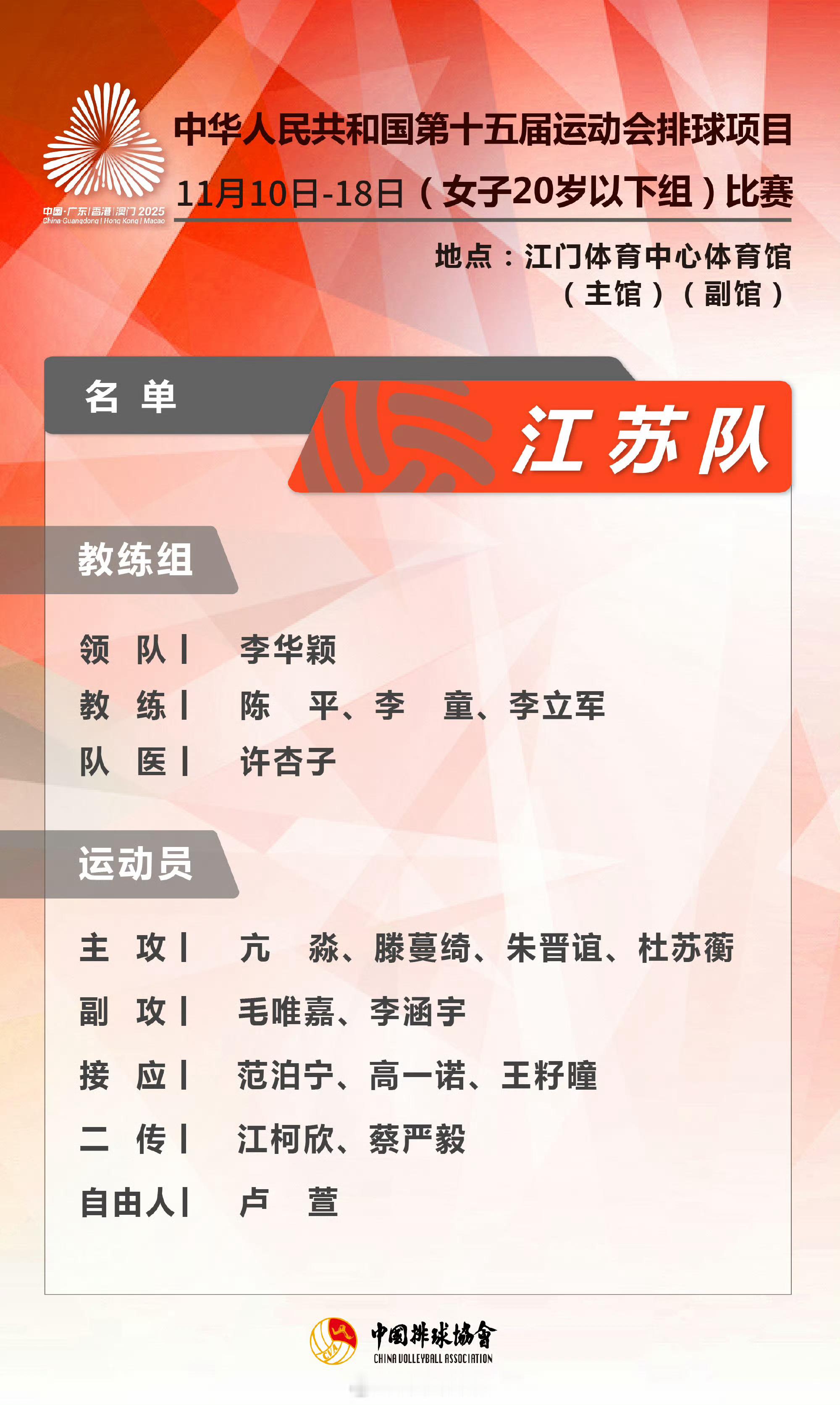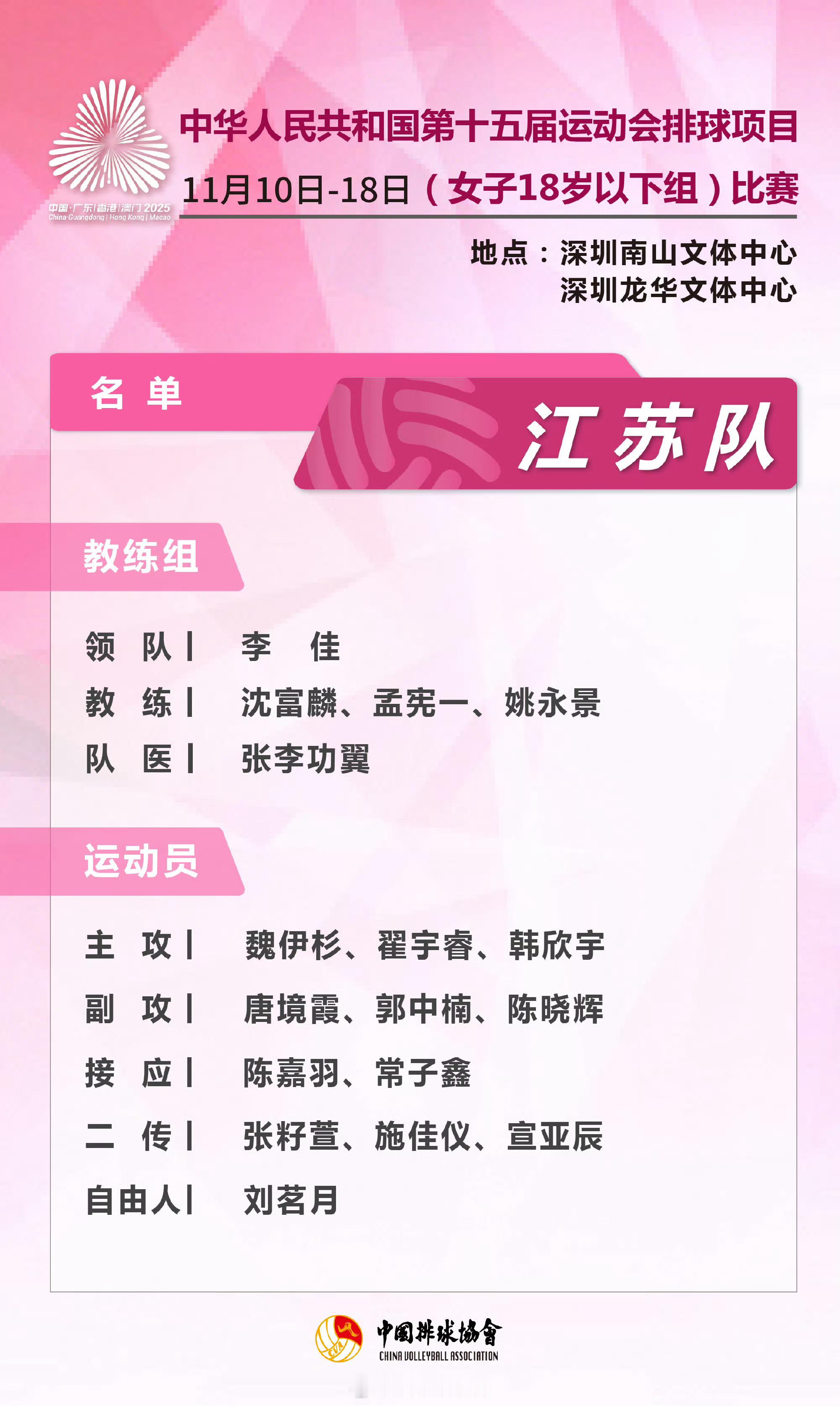 【联赛】新赛季女排联赛江苏女排23人大名单:主攻6️⃣:吴梦洁(队长),唐欣,吴晗,滕蔓绮,魏伊杉,张常宁副攻6️⃣:万梓玥,杨佳,勇乐,李涵宇,毛唯嘉,郭中楠接应3️⃣:周页彤,范泊宁,龚翔宇二传5️⃣:孙燕,张籽萱,施佳仪,宋嘉译,刁琳宇自由人3️⃣:倪非凡,陈奕帆,何慕【对比】🆚全运会成年组名单:靳皓❌🆚全运会U20名单:滕蔓绮✅,李涵宇✅,毛唯嘉✅,范泊宁✅🆚全运会U18名单:魏伊杉✅,郭中楠✅,张籽萱✅,施佳仪✅