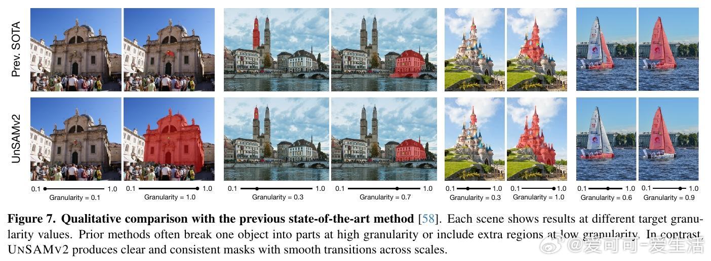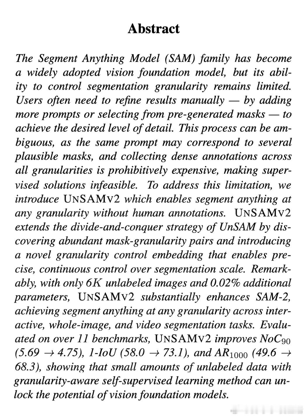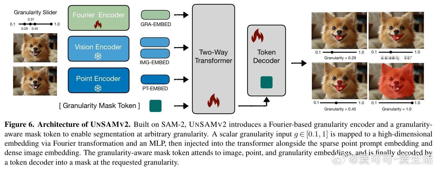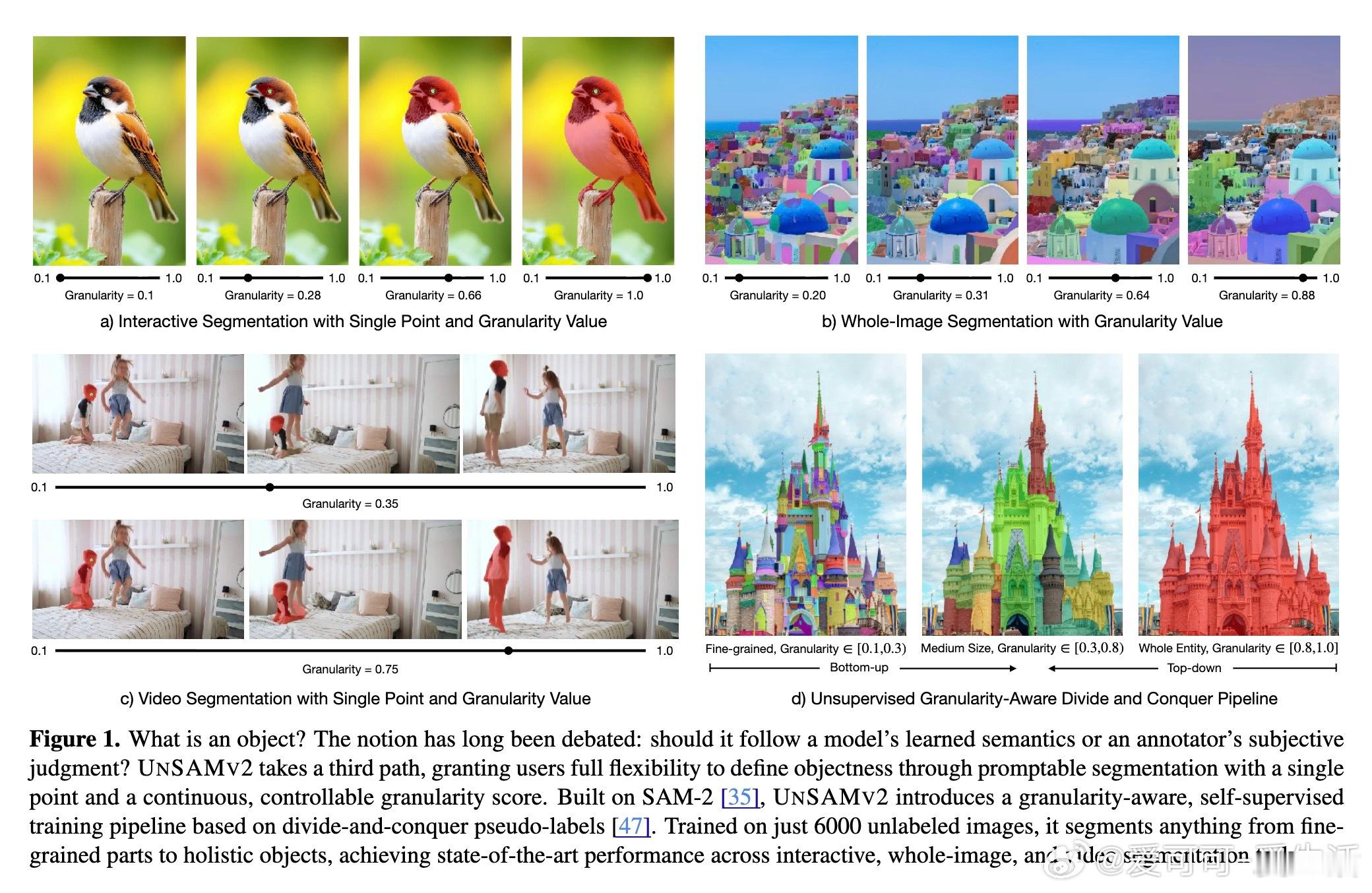 [CV]《UnSAMv2: Self-Supervised Learning Enables Segment Anything at Any Granularity》J Yu, T Darrell, X Wang [UC Berkeley] (2025) UnSAMv2:自监督学习实现任意粒度的“Segment Anything”“什么是物体?”这个问题在视觉认知领域长期争论不休。传统的Segment Anything Model(SAM)系列虽已广受欢迎,但其分割粒度控制能力有限,用户常需通过额外提示或从固定的几个预生成掩码中选择,既繁琐又模糊。为此,UnSAMv2提出了一种自监督学习框架,能在无需人工标注的情况下,实现从细粒度部分到整体物体的任意连续粒度分割。其核心创新包括:1. 粒度感知的分而治之策略:利用无监督方法(如MaskCut的归一化割)发现实例掩码,并递归合并细粒度部分,形成层次化伪标签,赋予每个掩码一个连续的粒度标量,反映其在部分-整体层级中的相对尺度。2. 粒度编码与解码架构:在基于SAM-2的基础上,设计了傅里叶特征映射的粒度编码模块和一个粒度感知的掩码Token,使模型能根据单点提示和连续粒度输入,预测对应粒度的掩码,实现分割的连续可控。3. 高效且轻量的训练:仅用6,000张无标签图像,训练4小时(2个A100 GPU),微调解码器部分参数(0.02%增量),即可显著提升SAM-2性能。4. 广泛验证与领先表现:在超过11个基准测试(包括交互式分割、整体图像分割和视频分割)中,UnSAMv2均超越SAM-2和之前的先进方法。关键指标NoC90从5.69降至4.75,1-IoU从58.0%提升至73.1%,AR1000从49.6升至68.3,充分证明了自监督的粒度学习潜力。5. 深入启示:传统监督训练强加的人为物体定义限制了模型对视觉层次结构的理解。UnSAMv2通过无监督学习从图像统计中发现层级关系,将分割从离散预测转变为连续、可解释的推理过程,为视觉基础模型注入了新的灵活性和表达能力。6. 实用价值:用户只需单点点击并调节粒度滑块,即可快速得到所需层级的掩码,极大提升了交互效率和分割灵活性,适应多种下游任务如部件分析、实例聚合或大规模区域编辑。总结来说,UnSAMv2突破了现有分割模型受限于固定粒度和人工标注的瓶颈,展现了自监督学习在视觉分割层次理解上的巨大潜力,推动了“Segment Anything”向任意粒度、连续可控方向迈进。项目主页:yujunwei04.github.io/UnSAMv2-Project-Page/ 论文链接:arxiv.org/abs/2511.13714