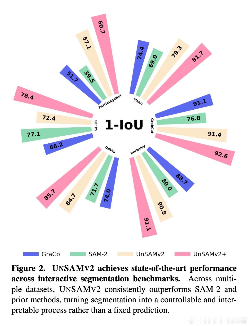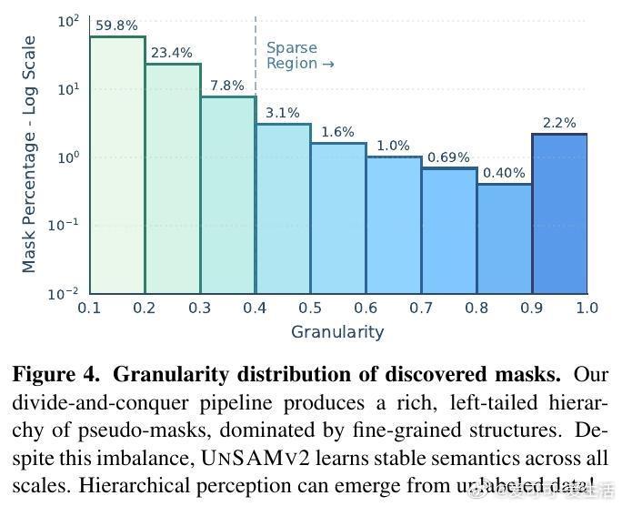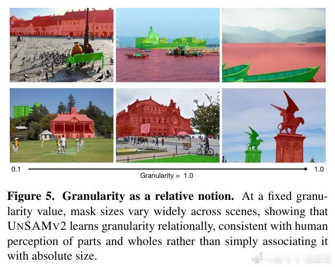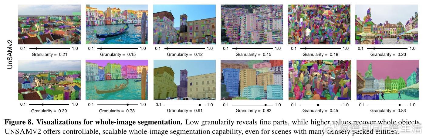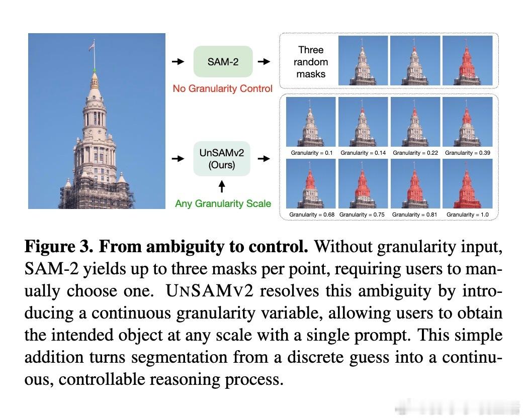 [CV]《UnSAMv2: Self-Supervised Learning Enables Segment Anything at Any Granularity》J Yu, T Darrell, X Wang [UC Berkeley] (2025) UnSAMv2:自监督学习实现任意粒度的“Segment Anything”“什么是物体?”这个问题在视觉认知领域长期争论不休。传统的Segment Anything Model(SAM)系列虽已广受欢迎,但其分割粒度控制能力有限,用户常需通过额外提示或从固定的几个预生成掩码中选择,既繁琐又模糊。为此,UnSAMv2提出了一种自监督学习框架,能在无需人工标注的情况下,实现从细粒度部分到整体物体的任意连续粒度分割。其核心创新包括:1. 粒度感知的分而治之策略:利用无监督方法(如MaskCut的归一化割)发现实例掩码,并递归合并细粒度部分,形成层次化伪标签,赋予每个掩码一个连续的粒度标量,反映其在部分-整体层级中的相对尺度。2. 粒度编码与解码架构:在基于SAM-2的基础上,设计了傅里叶特征映射的粒度编码模块和一个粒度感知的掩码Token,使模型能根据单点提示和连续粒度输入,预测对应粒度的掩码,实现分割的连续可控。3. 高效且轻量的训练:仅用6,000张无标签图像,训练4小时(2个A100 GPU),微调解码器部分参数(0.02%增量),即可显著提升SAM-2性能。4. 广泛验证与领先表现:在超过11个基准测试(包括交互式分割、整体图像分割和视频分割)中,UnSAMv2均超越SAM-2和之前的先进方法。关键指标NoC90从5.69降至4.75,1-IoU从58.0%提升至73.1%,AR1000从49.6升至68.3,充分证明了自监督的粒度学习潜力。5. 深入启示:传统监督训练强加的人为物体定义限制了模型对视觉层次结构的理解。UnSAMv2通过无监督学习从图像统计中发现层级关系,将分割从离散预测转变为连续、可解释的推理过程,为视觉基础模型注入了新的灵活性和表达能力。6. 实用价值:用户只需单点点击并调节粒度滑块,即可快速得到所需层级的掩码,极大提升了交互效率和分割灵活性,适应多种下游任务如部件分析、实例聚合或大规模区域编辑。总结来说,UnSAMv2突破了现有分割模型受限于固定粒度和人工标注的瓶颈,展现了自监督学习在视觉分割层次理解上的巨大潜力,推动了“Segment Anything”向任意粒度、连续可控方向迈进。项目主页:yujunwei04.github.io/UnSAMv2-Project-Page/ 论文链接:arxiv.org/abs/2511.13714
