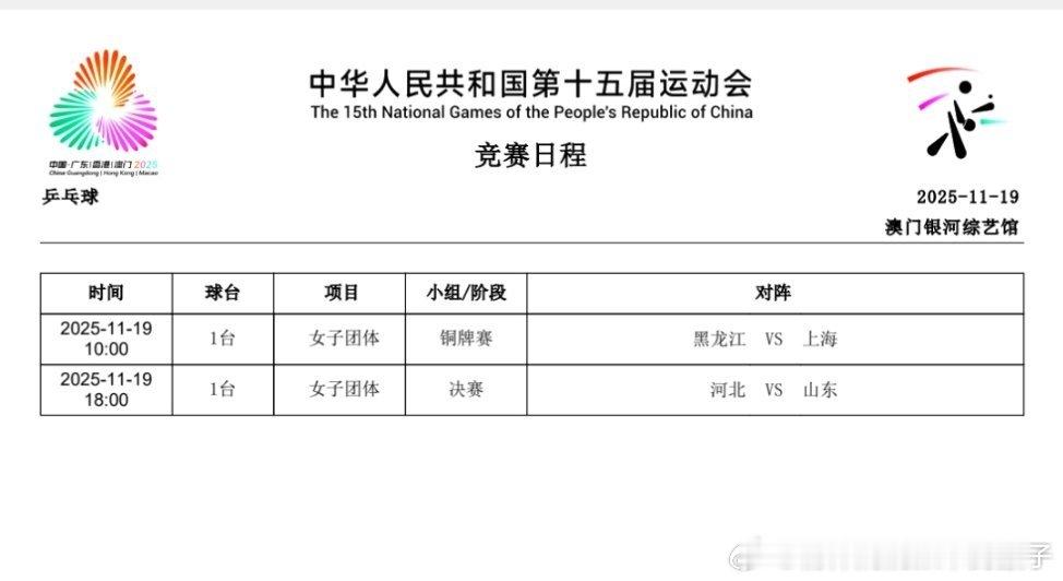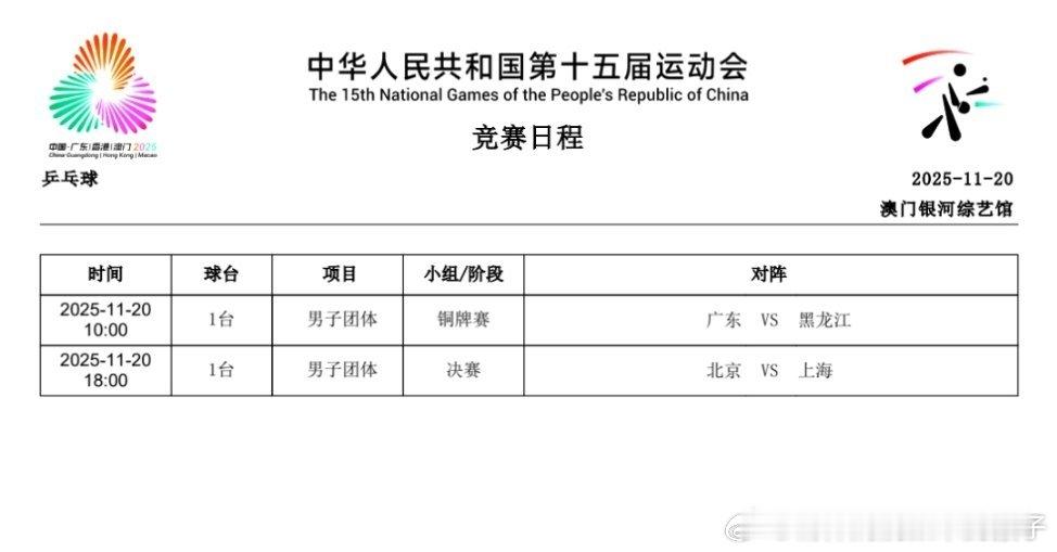 2025年第十五届全运会男、女团奖牌赛赛程:11月19日10:00 女团铜牌赛:黑龙江队VS上海队18:00 女团金牌赛:河北队VS山东队11月20日10:00 男团铜牌赛:广东队VS黑龙江队18:00 男团金牌赛:北京队VS上海队