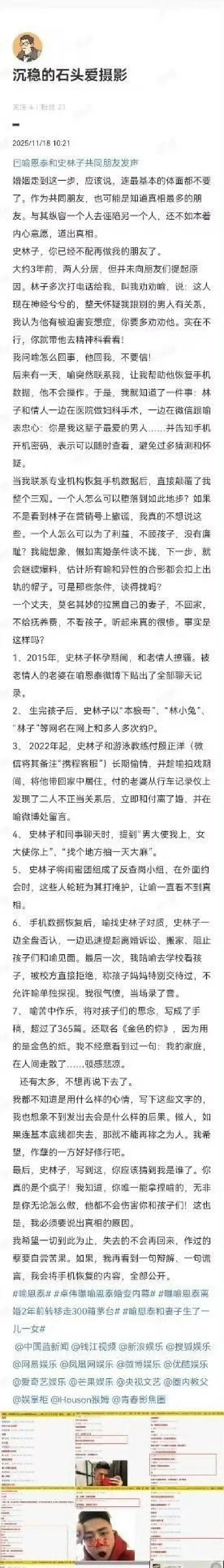 曝喻恩泰妻子出轨喻恩泰被曝多年见不到女儿,起因是前妻史林子先出来控诉他甩手不管。结果一位自称两人老友的网友甩出长文,指史林子婚内多次出轨,还亲口承认不让男方看孩子。聊天记录里那句“他活该”被疯转,风向一夜倒,骂声从秀才转向主持人。我看报道说男方读博期间推掉片约带娃,女方却忙着飞国外约会,如今孩子八岁,爸爸只能隔着校门远远望。婚内谁对不起谁外人说不清,拿孩子当武器就太过分,血缘不是开关,说关就关。真相没盖棺,但把娃卷进成人恩怨最损。孩子不是谈判筹码,想看娃的爸爸不该被挡在门外。