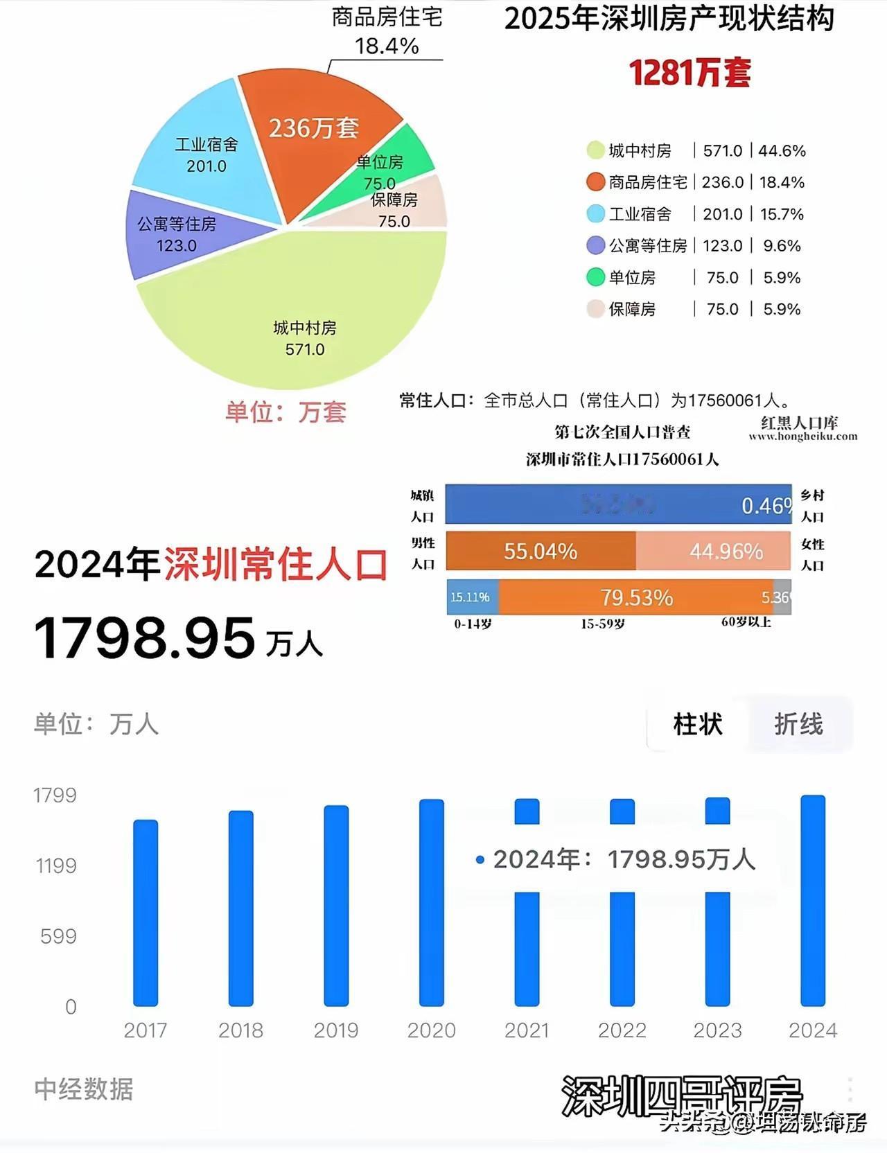 深圳目前有近1800万人口,住房主要是城中村房子、商品房、工业宿舍、公寓、单位房、保障房等,共1281万套,其中商品房只有236万套,占比只有18.4%,城中村房则有571万套,占比有44.6%,这个比例还是挺高的,相反,深圳商品房数量还是不足按照一户三人来算,深圳也只有七百万人入住商品房,要达到1000万人入住,最少还需要100万套房子。