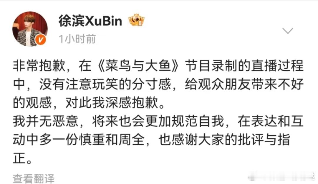 《菜鸟与大鱼》节目录制直播时,谢可寅让徐滨“小心竿儿(鱼竿)”,徐滨回复:“嗯哼你别这么叫我”,引发争议。对此,徐滨发文向观众道歉,“没有注意玩笑的分寸感,给观众朋友带来不好的观感,对此我深感抱歉。我并无恶意。”