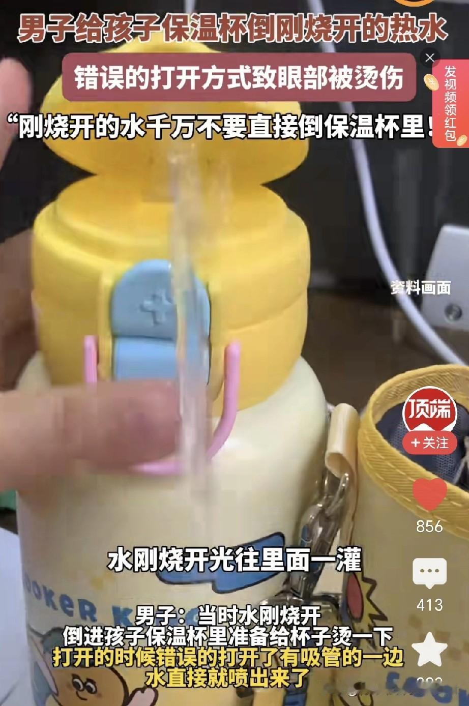 男子向网友分享经验,孩子的保温杯千万不能倒开水,否则十分危险。 原来,男子把水烧开后直接倒进孩子的保温杯,想烫一烫杯子。打开时,他不小心让吸管正对着自己,开水顺着吸管喷射而出,溅到眼窝,当时就被烫伤了,烫杯子不应该盖上盖子吧! 显然,这位爸爸平时不怎么带娃。带吸管的保温杯一般都有警告标识,不能装超过45℃的水。常带娃的人都清楚,孩子保温杯里的水一定是能直接饮用的温度。 保温杯不宜倒满,留2厘米空间,既能保温又不会漏水,也不会出现那种喷射情况。 别倒100度的热水,60度左右最佳,直接喝也不会烫嘴。成年人得为自己的无知付出代价。一把年纪了,连个保温杯都不会用。还好这个糊涂蛋只伤到了自己,真是不幸中的万幸。生活中要远离这样的人,谁知道他下次还会做出什么蠢事。