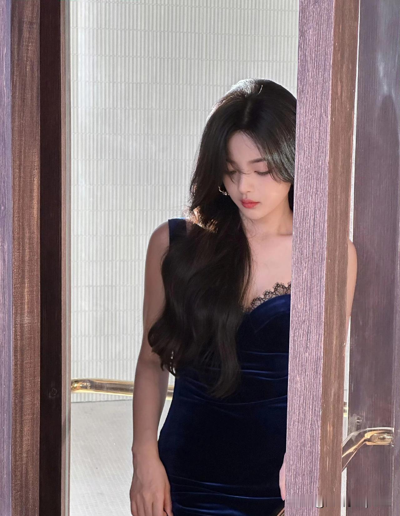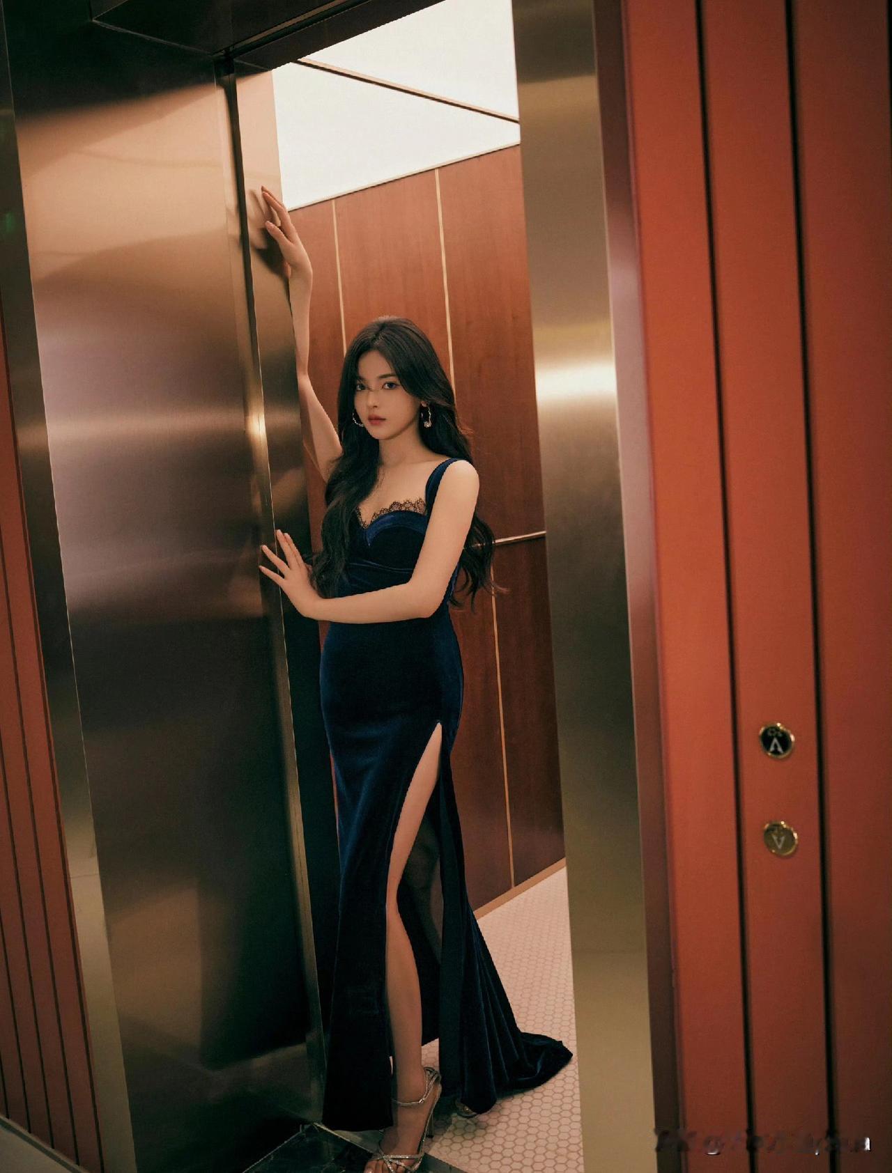 杨超越这身宝蓝色丝绒礼服真是绝了! 大领口把锁骨线条衬得超精致,高开叉设计让大长
