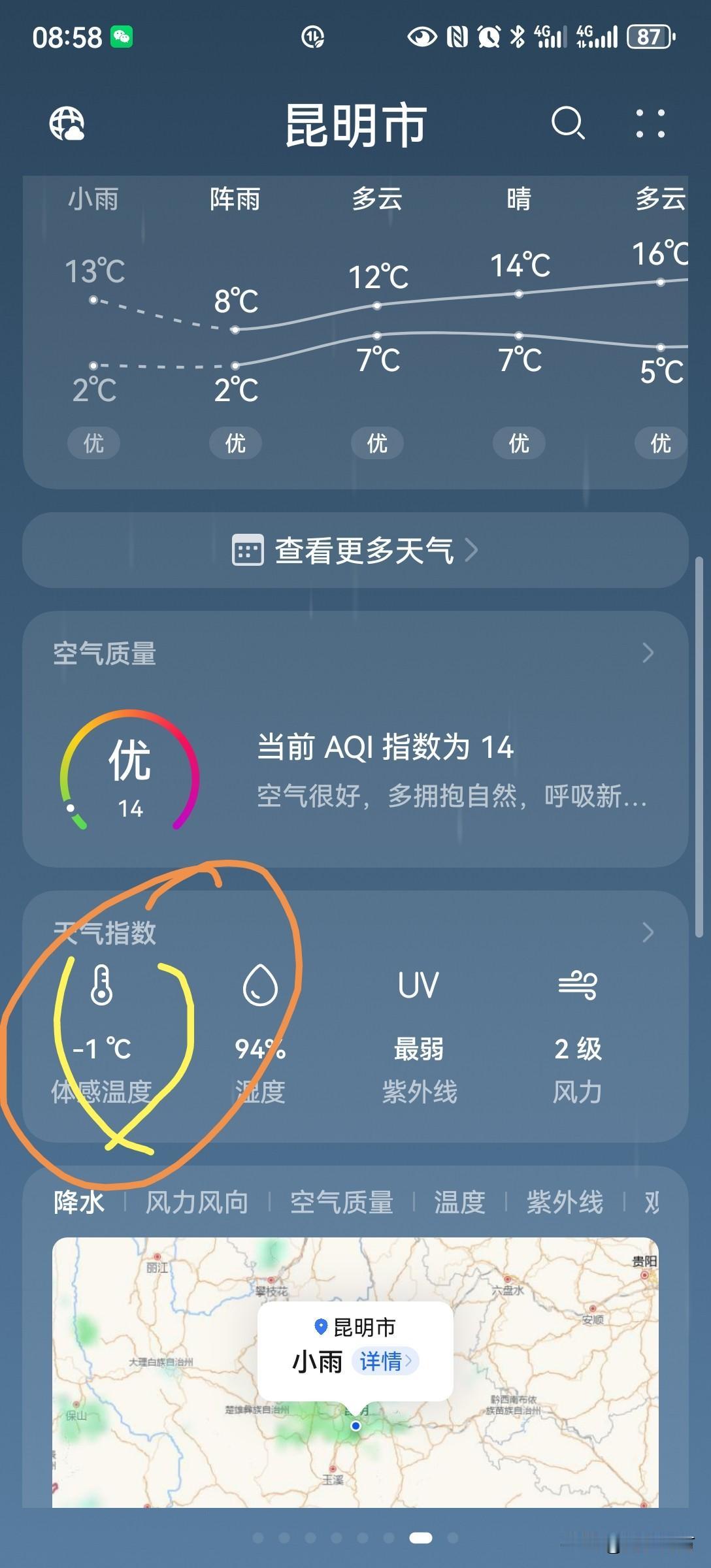 全国性寒潮来袭,西南F4上午气温创入秋以来新低! 8时50分:重庆8度,成都6度,贵阳4度,昆明2度,西南四大都市上班路上瑟瑟发抖, 其中以昆明为甚,在大风与小雨的加持下,体感温度竟达零下一度,晚秋如春天般寒凉,实在少见[捂脸][捂脸]