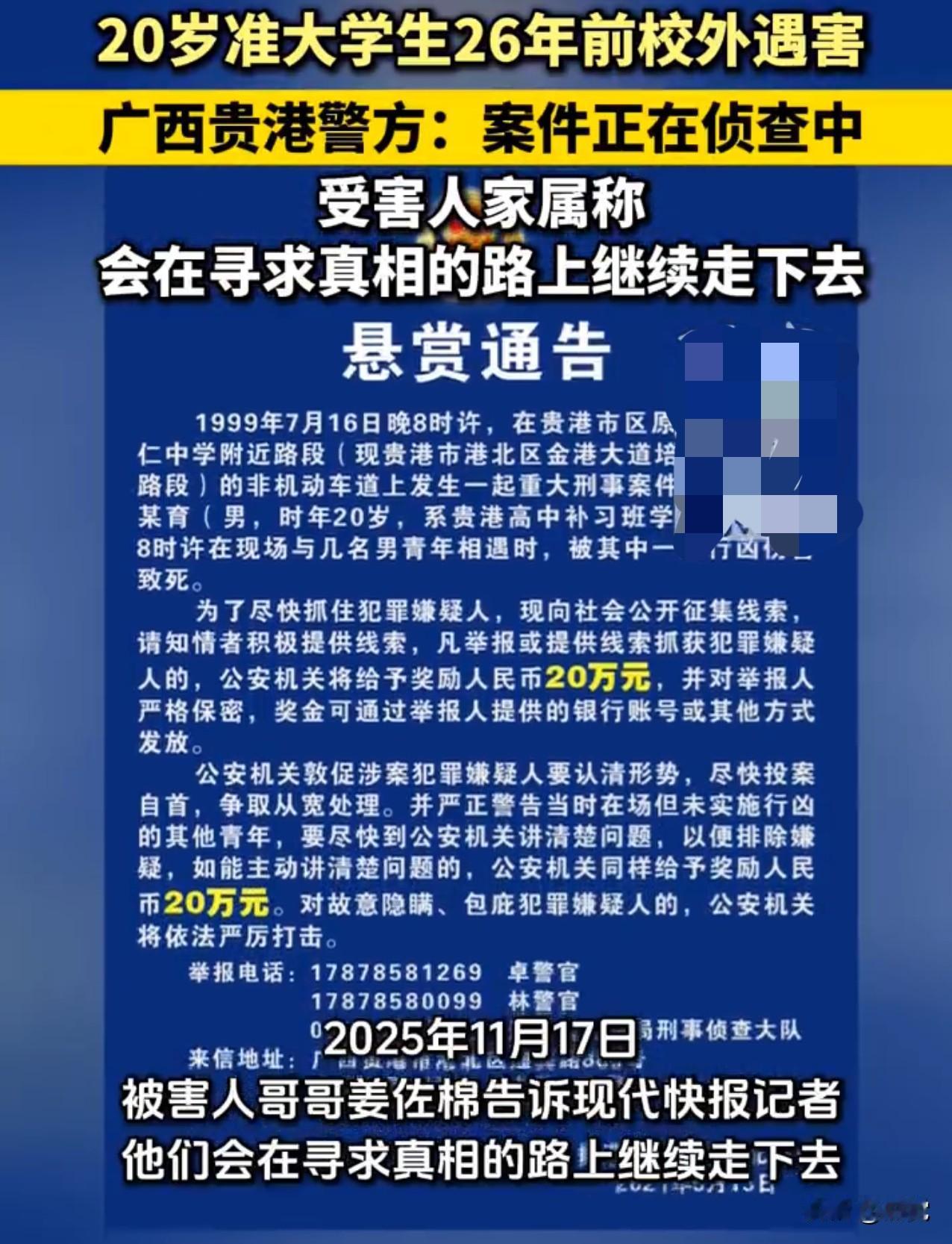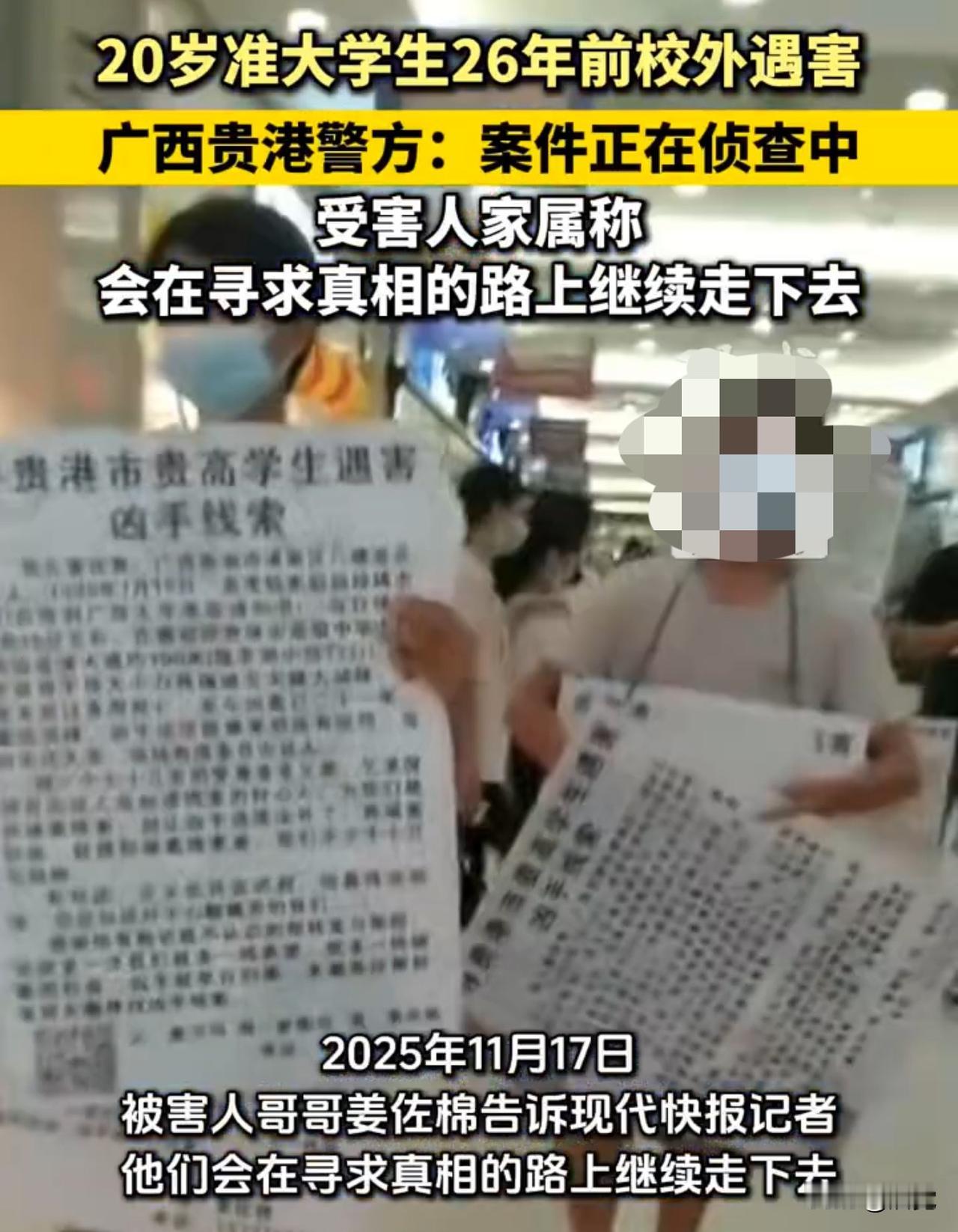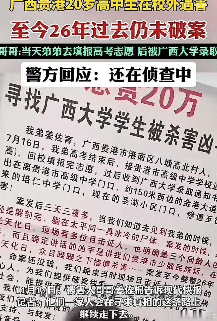 准大学生26年前遇害仍未破案 警方回应准大学生26年前遇害 广西贵港20岁高中生在校外遇害 至今26年过去了 案件尚未被侦破 11月17日,被害人哥哥姜佐棉告诉记者 他们一家人会在寻求真相 不畏艰难无论怎样都会坚持 在这条坎坷路上继续走下去 直到抓到凶手为止 以告慰弟弟的在天之灵 当地警方也回应记者称 案件还在侦查中 在寻找案件的突破口 希望了解有关线索的人士协助