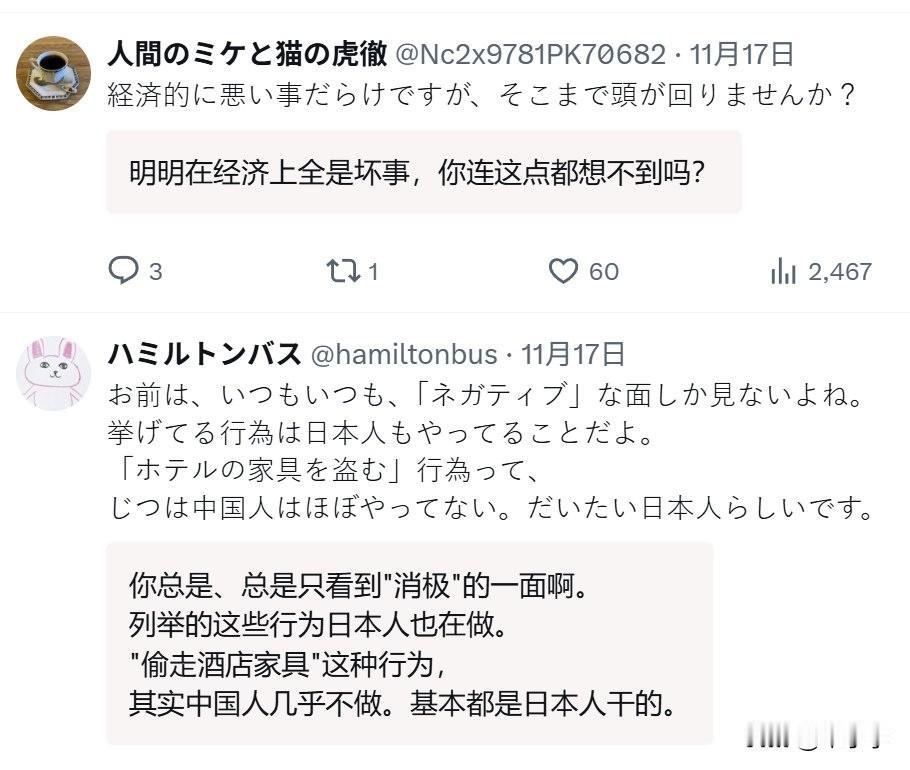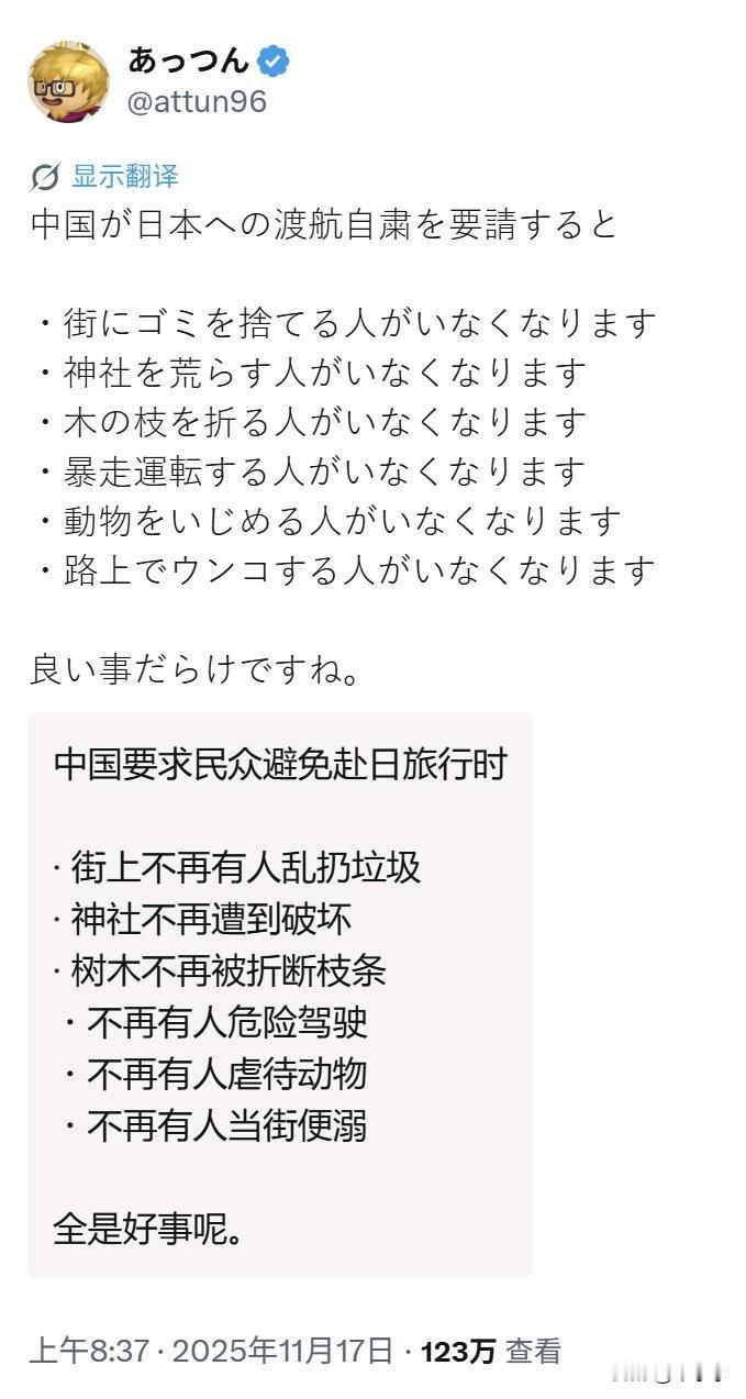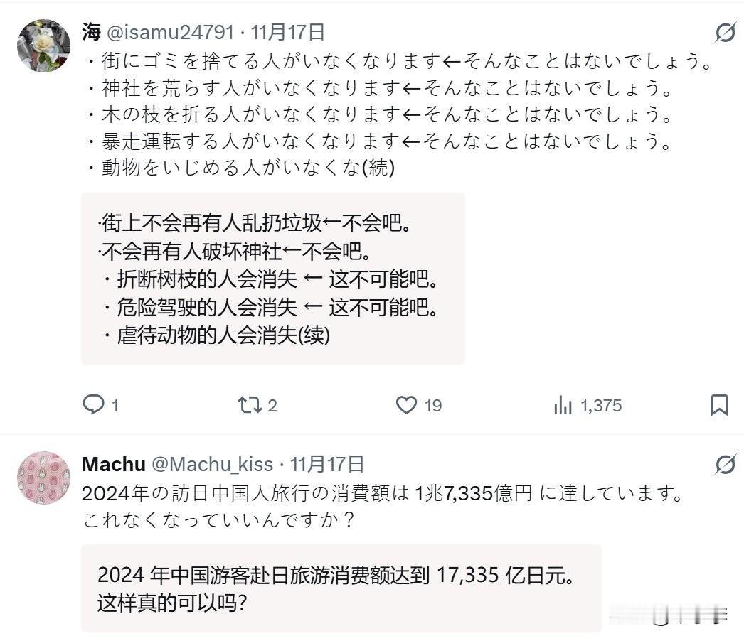 日本网上“中国游客不来日本到底是好事还是坏事”的争论。 他们这么快就忘了疫情的时候脏乱差的东京城了,搞脏城市哪里需要外国人来出力[吃瓜群众] 日媒常年的双标报道起作用了,实际上美西方穷游的背包客们和🇯🇵的低素质人群才是造成这一切低素质行为的主要人群[抠鼻]中国游客不前往日本旅游有何影响 日本旅游