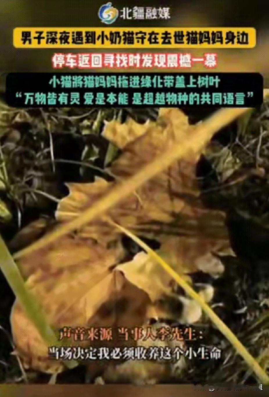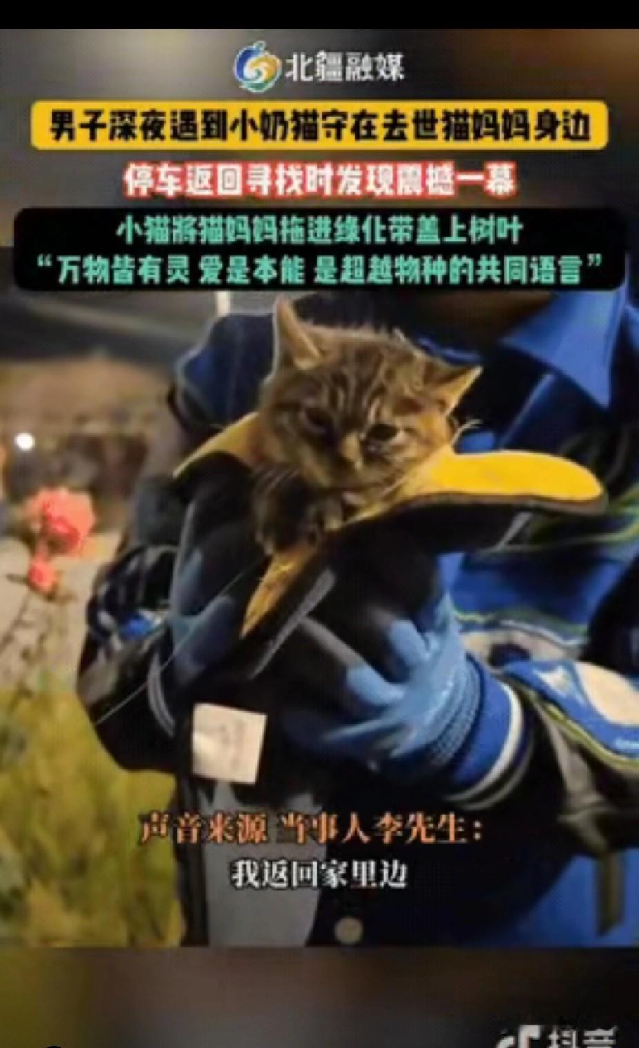 近日,北京,一男子深夜发现一只小奶猫守在去世的猫妈妈身边,当他停车返回去寻找时,