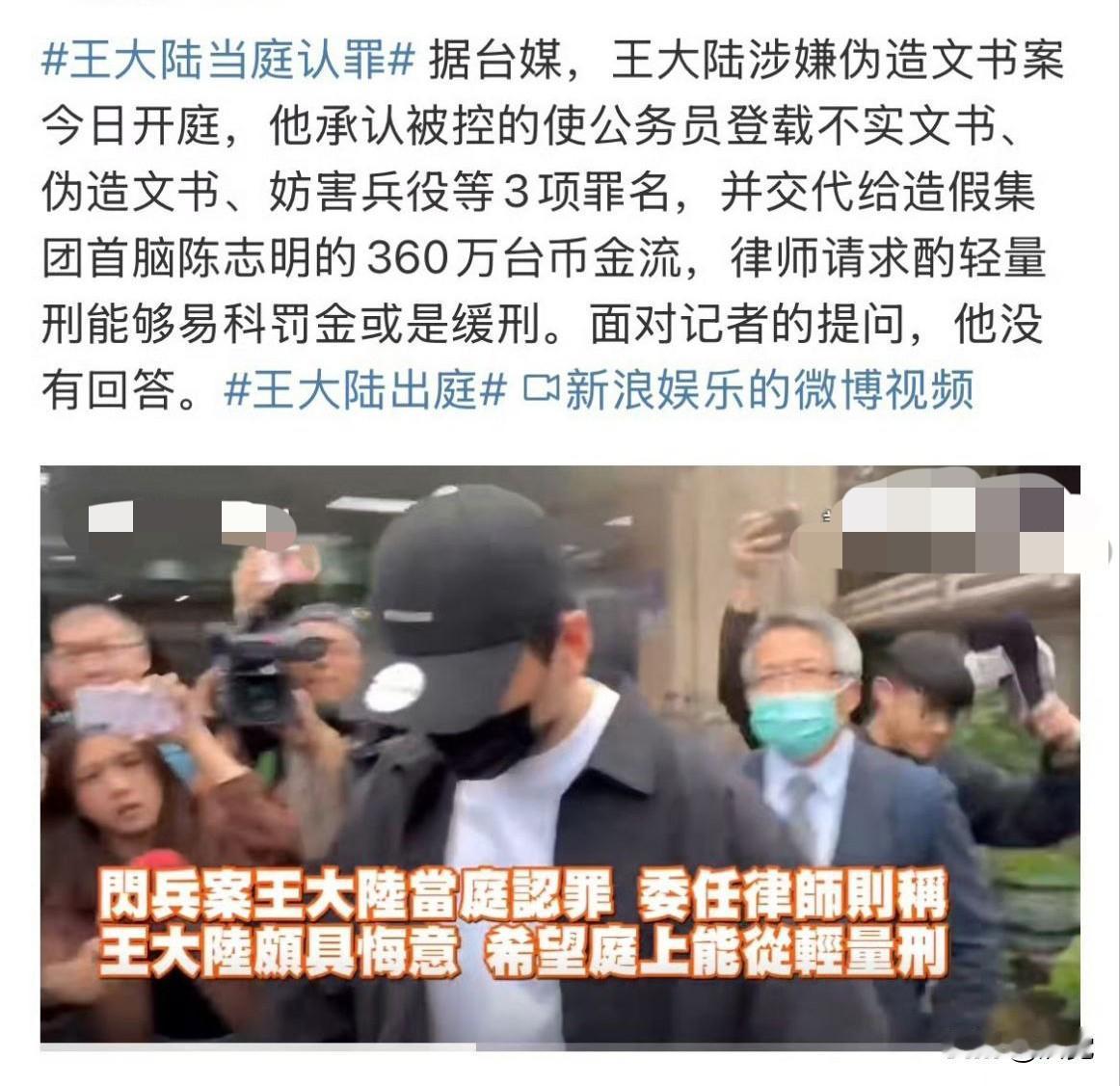王大陆这事儿真挺让人唏嘘不语的 花钱人伪造病历逃兵役 当庭认了三项罪还说“无知犯错” 公众人物本该守规矩 兵役是公民义务哪能靠钱蒙混过关 就算认罪态度好求轻判 但星途肯定毁得差不多了 明星之路越走越远了 这事儿也给大家提了醒 再红也不能碰法律红线 侥幸心理迟早翻车 因果有轮回 苍天饶过谁