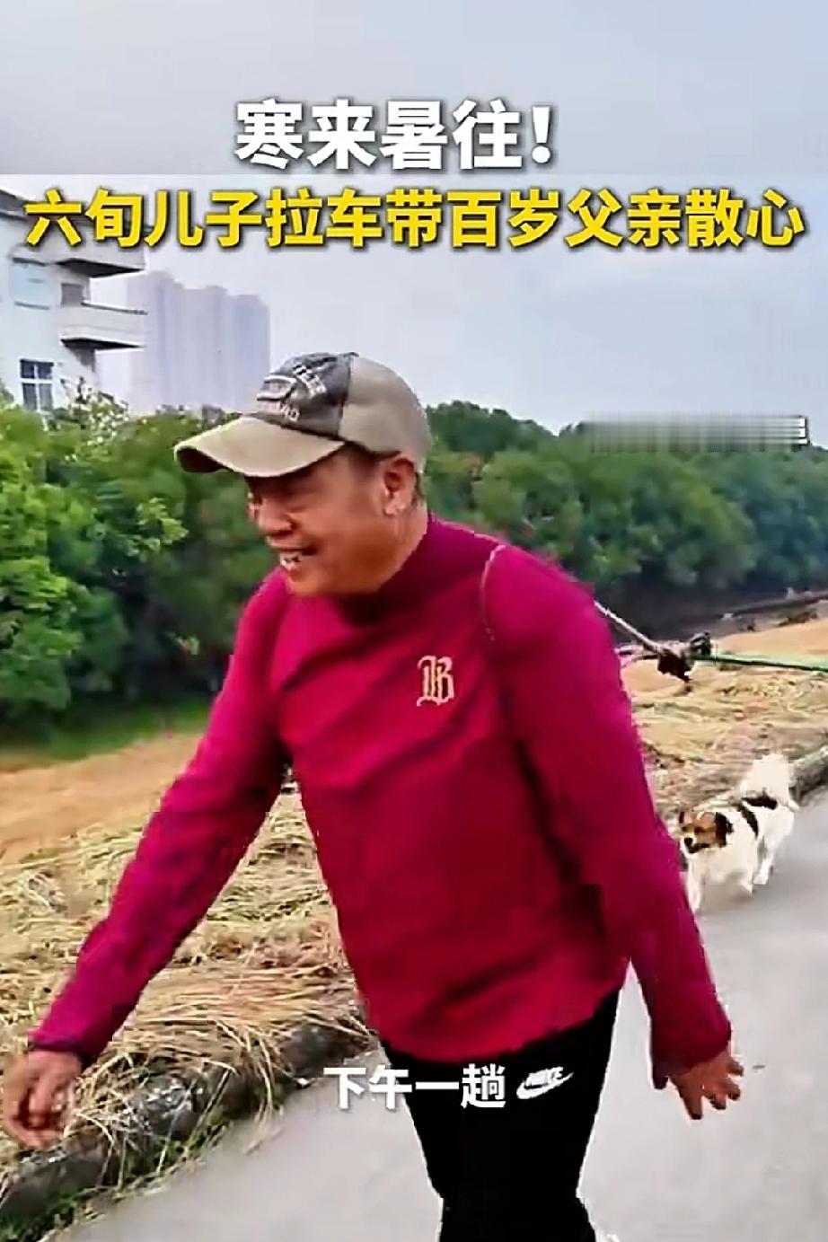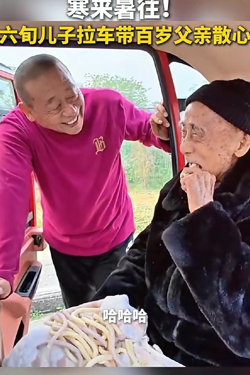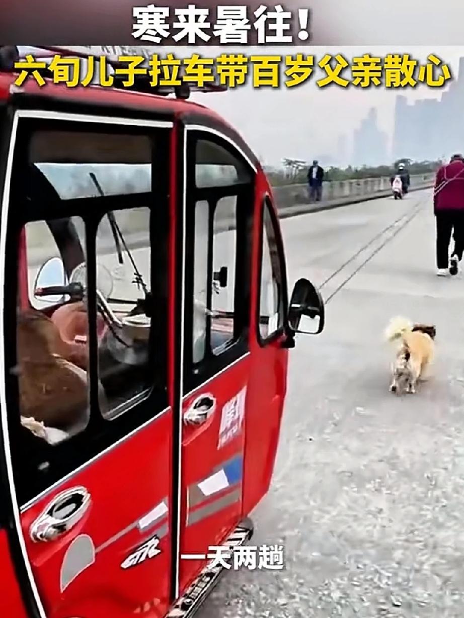 寒来暑往,六旬儿子拉车带百岁父亲散心,已有三四年的时间,三轮车里给父亲准备了水和一些食物,把父亲照顾的特别干净,儿子的快乐时光是拉着父亲,走在郊外的公路上,觉的空气也是甜的,能够看着百岁父亲,开心的活着就是幸福,父子俩发自内心的笑容令人羡慕! “你养我小,我养你老”这句话在父子身上体现的淋漓尽致,有父亲的陪伴,儿子觉的既踏实又幸福,有个孝顺的儿子不知是多少父母心中所向往的!