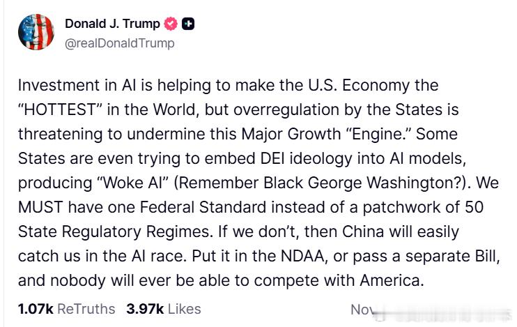 【黄金时代】川普呼吁给人工智能过度监管松绑,警惕“DEI人工智能”川普:对人工智能的投资正助力美国经济成为全球“最火热”的经济,但各州的过度监管却威胁着这一主要的增长“引擎”。一些州甚至试图将多元、公平和包容(DEI)理念融入人工智能模型,制造出所谓的“觉醒人工智能”(还记得“黑人乔治·华盛顿”吗?)。我们必须制定统一的联邦标准,而不是由50个州各自为政的监管体系拼凑而成。否则,中国将在人工智能竞赛中轻易超越我们。将其纳入《国防授权法案》(NDAA),或通过一项单独的法案,届时将无人能与美国匹敌。