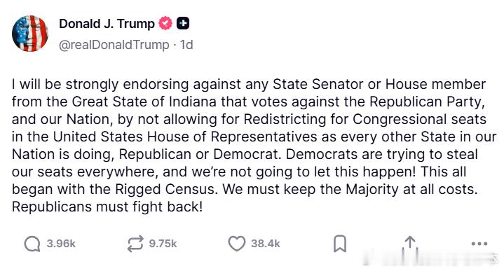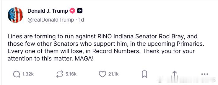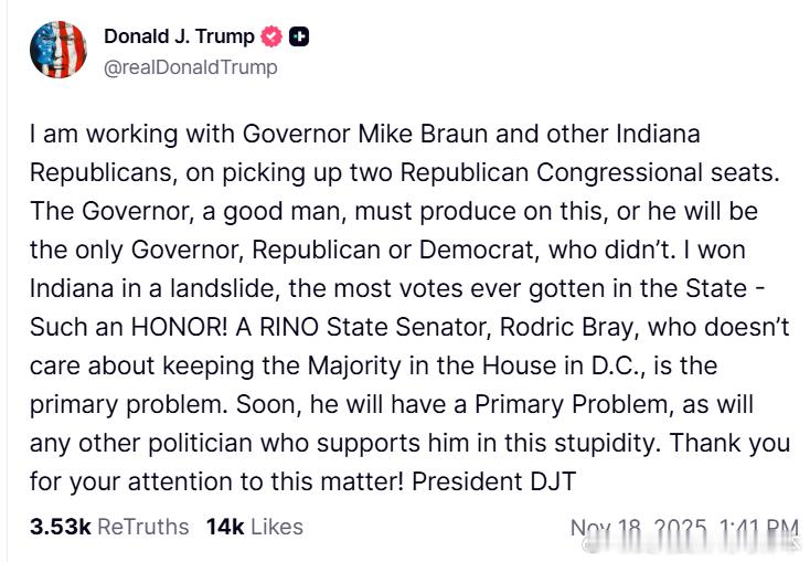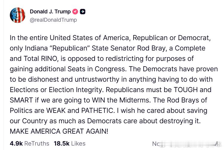 【黄金时代】川普两天三TRUTHS, 斥责印第安纳共和党参议员罗德·布雷,因为布雷反对划分选区川普:在美国,无论共和党还是民主党,只有印第安纳州的“共和党”州参议员罗德·布雷(Rod Bray)——一个彻头彻尾的RINO——反对为了增加国会席位而重新划分选区。民主党在任何与选举或选举公正性相关的事情上都已证明其不诚实和不可信赖。如果我们想赢得中期选举,共和党人必须强硬而睿智。政坛上的罗德·布雷之流软弱无能,令人作呕。我真希望他能像民主党人热衷于摧毁国家那样,关心拯救我们的国家。让美国再次伟大!各路人马正摩拳擦掌,准备在即将到来的初选中挑战印第安纳州“名义共和党人”罗德·布雷参议员及其少数支持者。他们个个都将惨败,而且败选人数将创下纪录。感谢您关注此事。让美国再次伟大!我将强烈反对任何来自印第安纳州的州参议员或众议员,如果他们投票反对共和党和我们的国家,反对像我们国家其他所有州(无论共和党还是民主党)那样重新划分美国众议院的选区。民主党人正试图窃取我们在各地的席位,我们绝不会让他们得逞!这一切都始于那次被操纵的人口普查。我们必须不惜一切代价保住多数席位。共和党人必须奋起反击!我正与州长迈克·布劳恩和其他印第安纳州共和党人合作,争取赢得两个共和党国会席位。州长是一位好人,他必须拿出成绩,否则他将成为历史上唯一一位未能做到这一点的州长,无论共和党还是民主党。我在印第安纳州以压倒性优势获胜,获得了该州有史以来最高的选票——这是莫大的荣幸!主要问题在于一位名叫罗德里克·布雷的“名义共和党人”(RINO)州参议员,他根本不在乎保住众议院在华盛顿特区的多数席位。很快,他自己就会面临党内初选的危机,任何支持他这种愚蠢行为的政客都会面临同样的命运。感谢您对此事的关注!DJT总统