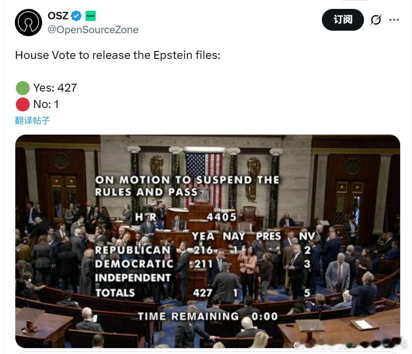 【黄金时代】快讯,在一连串来来回回的拉扯结束后,众议院以不可思议的427-1的高票数,同意解密爱泼斯坦文件!(共和党人克莱·希金斯是唯一投反对票的人。)