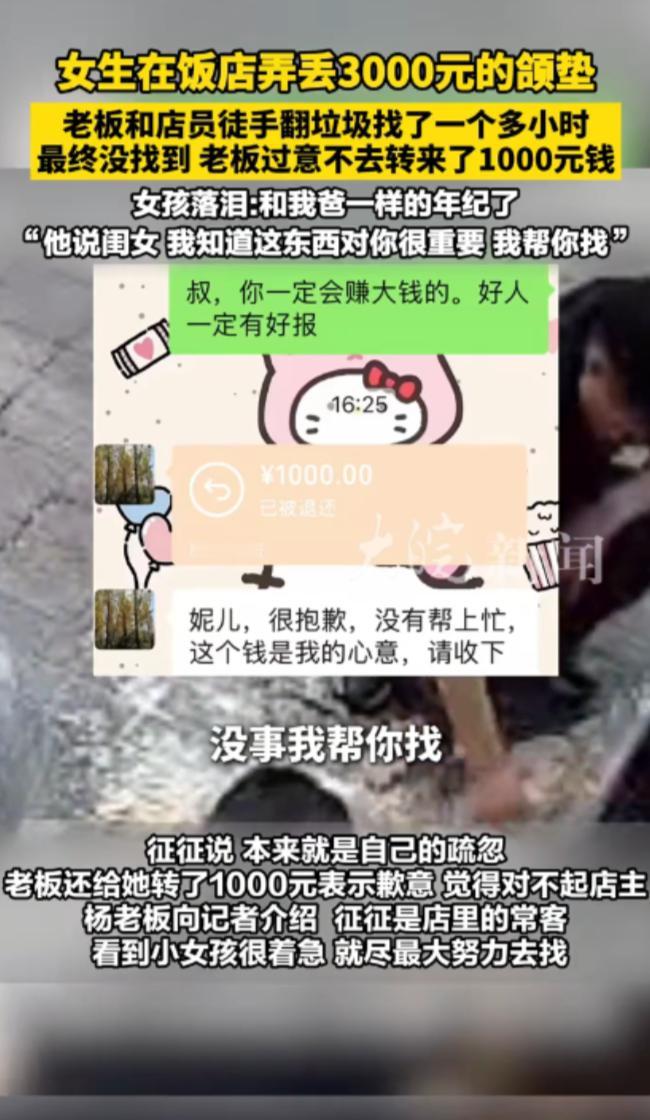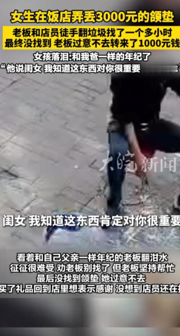 “活该他发财!”11月15日,河南郑州,一女生在饭店吃饭时,随手将价值3000元的颌垫放在桌上,结果不小心弄丢了,老板和员工得知后,徒手在垃圾桶里翻找,最终还是没能找到,老板觉得愧疚,就给女孩转了1000块钱!网友:这样的老板怎能不火!“活该他发财!”11月15日,河南郑州,一女生在饭店吃饭时,随手将价值3000元的颌垫放在桌上,结果不小心弄丢了,老板和员工得知后,徒手在垃圾桶里翻找,最终还是没能找到,老板觉得愧疚,就给女孩转了1000块钱!网友:这样的老板怎能不火! 事儿的主角是个叫征征的年轻姑娘,刚毕业没多久经济上还不太宽裕,平时总爱来这家胡辣汤店吃饭,算是老顾客了,那天她像往常一样来店里就餐,因为戴着一副定制颌垫吃饭不方便,就随手取下来放在了桌子上,一顿饭吃得挺舒心,可临走时一忙乱,竟把这副颌垫忘得一干二净,抹嘴起身就走了。 等征征反应过来自己丢了东西,已经是离开店铺挺久之后了,这副颌垫可不是普通物件,是定制款,价值 3000 块钱,对刚参加工作的她来说,可不是一笔小数目,她急得不行赶紧掉头往胡辣汤店跑,心里抱着一丝希望,盼着颌垫还能在店里。 回到店里征征一眼就看到自己刚才坐的桌子已经收拾干净了,颌垫早就没了踪影,她赶紧跟店员说明情况,店员一听也挺着急,立刻帮忙在店里四处查找,柜台、角落、桌椅底下都翻了个遍,可就是没找到。 老板得知消息后,也急匆匆地赶了过来,问清楚颌垫的样子和丢失的大致时间后,没多说一句话,直接吩咐员工:“把店里的垃圾桶都推过来,咱们一起找!” 店里的垃圾桶里装着各种餐余垃圾、纸巾、塑料袋,又脏又乱,气味也不好闻,可老板二话不说,蹲下身就徒手伸进垃圾桶里翻找起来,员工们也跟着一起动手,一个个都不顾脏累,仔仔细细地在成堆的垃圾里扒拉。 征征站在一旁,看着老板和员工们为了自己的东西这么卖力,心里又感动又过意不去,一个劲儿地劝他们:“算了算了,别找了,怪脏的,是我自己不小心弄丢的,不怪你们。” 可老板和员工们压根没停下手里的动作,一边翻找一边安慰她:“没事,再找找看,万一找到呢?这东西对你来说挺重要的。” 就这么着几个人蹲在垃圾桶旁,徒手翻找了足足一个多小时,指尖都沾满了污渍,可最终还是没能找到那副颌垫,大概率是已经随着垃圾被运走了。 征征心里又失落又愧疚,觉得是自己的疏忽给店家添了这么大麻烦,还让大家跟着受脏受累,为了表达感谢,她特意去买了些礼物送给老板和员工,可老板却坚决不收,还反过来安慰她别太往心里去。 更让征征没想到的是,当天晚上老板竟然主动联系了她,二话没说就给她转了 1000 块钱,征征愣了,连忙推辞说这事儿完全是自己的责任,店家已经帮了大忙,怎么还能要老板的钱。 可老板却坚持让她收下,还跟她说:“姑娘,我知道你刚工作挣钱不容易,这东西在我店里丢了,我心里也挺过意不去的,这 1000 块钱你拿着,多少能帮你减轻点重新定制的负担,别因为这事儿太上火。” 老板的话让征征心里暖烘烘的,原本因为丢东西的懊悔和自责,一下子被这份突如其来的善意化解了,她知道按道理来说,自己弄丢东西,店家没有任何赔偿义务,可老板不仅带着员工徒手帮她找了一个多小时,还主动转钱补贴她,这份心意实在太珍贵了。 这件事被征征分享到网上后,很快就引发了网友们的热烈讨论,大家都被老板的做法圈粉了,评论区里满是 “活该他发财” 的留言,还有人说 “这样有格局、有人情味的老板,生意想不火都难”。 有网友说,现在很多商家都只想着赚钱,遇到这种顾客自己疏忽导致的问题,能敷衍两句就不错了,可这家店的老板却反其道而行之,不光不推诿还主动承担起责任,这份同理心太难得了。 也有网友说3000 块的颌垫,老板转了 1000 块,看似是亏了可实际上他赚大了,这 1000 块钱,买来了顾客的信任,换来了全网的好评,相当于做了一次最成功的宣传,以后不管是郑州本地的人,还是外地来旅游的人,大概率都会想着去这家店尝尝味道,这份口碑可不是花钱能随便买来的。 征征说,以后这家店就是她的 “定点食堂” 了,还会推荐给身边所有朋友,而网友们的呼声,其实也代表了一种朴素的期待,一个有良心、有格局、懂共情的经营者,就应该被市场善待。 (信息来源:《女生在饭店弄丢3000元的颌垫 老板和店员徒手翻垃圾找了一个多小时 最终没找到 老板过意不去转来了1000元钱 女孩落泪:和我爸一样的年纪了 “他说闺女,我知道这东西对你很重要,我帮你找”》大皖新闻)