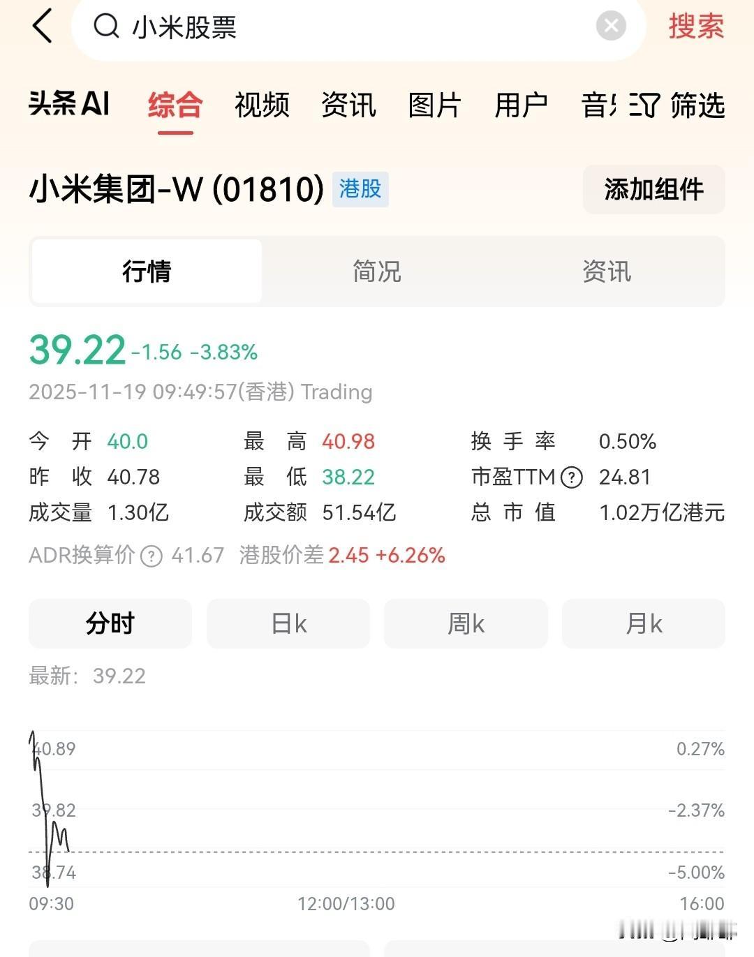 小米股票 今天开盘又下跌3.8%! 目前报价39.22港元每股! 我是没想到一场舆论真的会让小米股票跌得如此严重! 而且按照目前趋势 还有可能会继续下跌! 小米市值从最高1.6万亿港元已经缩水到了1.02万亿了,蒸发近6000亿港币! 可怜那些高位买入的散户 如今每天心都在滴血 ! 希望小米挺过这一次危机吧! 小米集团市值 小米股市