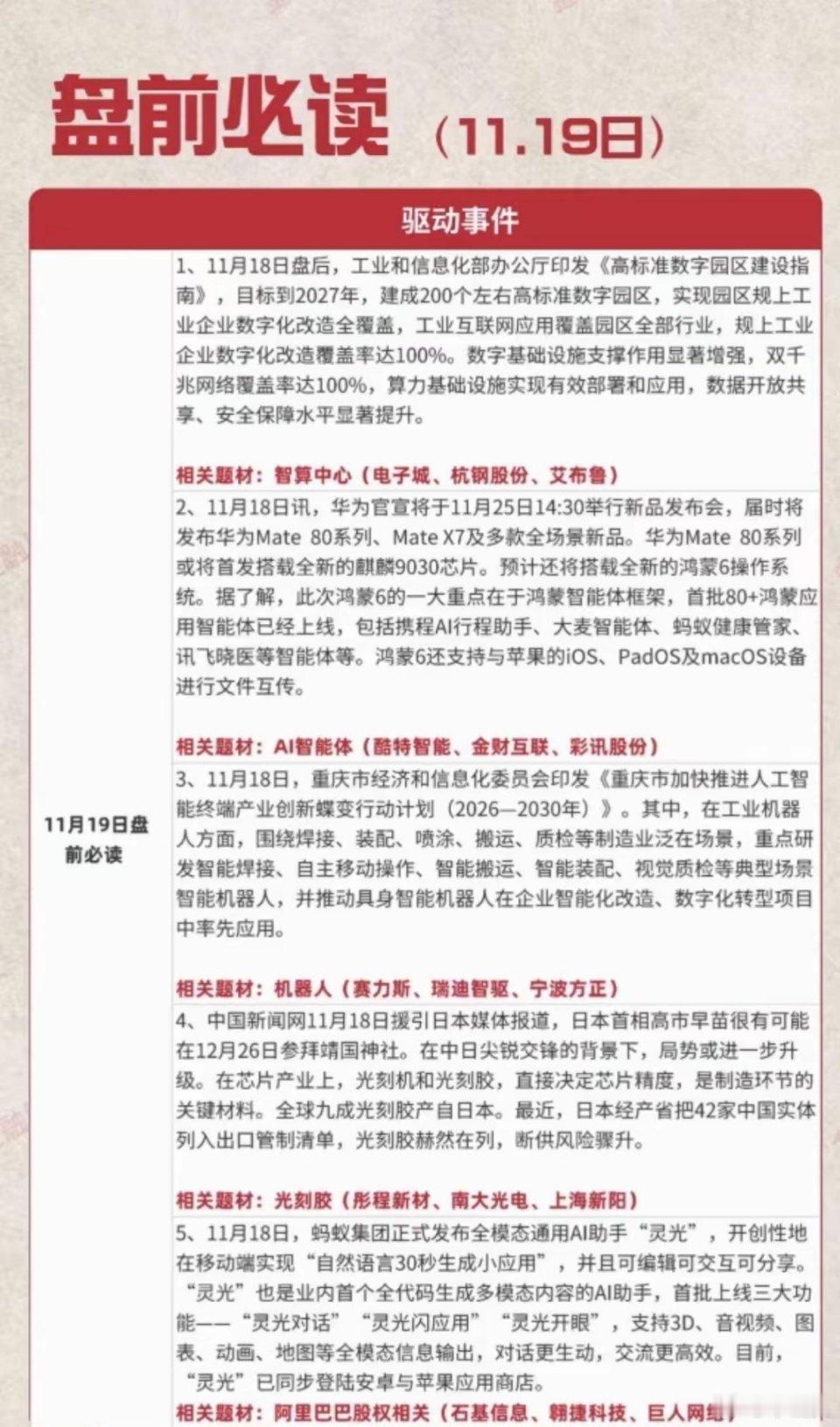 11.19财经信息梳理分析!这五大板块由政策、企业动态或供应链变化驱动:智算中心受益于工信部数字园区政策,算力基建需求扩容;AI智能体绑定华为鸿蒙6生态,智能体应用加速落地;机器人板块依托重庆工业机器人政策,制造场景需求释放;光刻胶受日本出口管制催化,国产替代紧迫性提升;阿里股权相关则因蚂蚁“灵光”AI助手落地,享生态协同红利,均指向数字经济、高端制造及自主可控主线。智算中心板块1. 电子城:聚焦科技园区运营,参与数字园区算力配套建设,旗下园区已布局双千兆网络,业务与数字园区改造需求直接绑定,短期受益政策催化,需关注项目落地进度。2. 杭钢股份:转型算力基建,旗下云计算数据中心是华东核心智算节点,可承接数字园区算力外包需求,政策推动下园区算力订单或扩容,需跟踪算力业务营收占比。3. 艾布鲁:提供数字园区算力配套运维服务,覆盖双千兆网络及算力设施保障,政策落地后运维需求或增长,需关注服务订单增速。4. 润泽科技:第三方IDC龙头,智算中心覆盖核心区域,可支撑数字园区高算力需求,政策下园区算力租赁需求上升,机柜资源利用率或提升。5. 中科曙光:算力硬件供应商,服务器、算力集群适配数字园区基建,政策推动下园区算力设备采购需求扩容,技术优势或强化订单获取能力。AI智能体板块1. 酷特智能:接入鸿蒙智能体生态,聚焦服装制造智能调度,华为发布会带热生态,制造类智能体或获更多企业订单,需关注生态合作进展。2. 金财互联:布局财税AI智能体,接入鸿蒙框架提供智能财税服务,鸿蒙6推广下企业端需求上升,财税场景落地案例或加速,需跟踪客户拓展。3. 彩讯股份:华为生态伙伴,邮件系统接入鸿蒙智能体实现智能办公,华为新品带热生态,办公类智能体渗透或提速,需关注生态订单增长。4. 拓尔思:AI语义智能体龙头,与鸿蒙生态合作布局企业内容管理,鸿蒙6框架落地后语义类需求扩容,需关注生态适配进度。5. 科大讯飞:与华为鸿蒙合作推进AI助手智能体,鸿蒙6强化场景适配,教育、办公类智能体或借生态拓用户,需关注合作产品上线节奏。机器人板块1. 赛力斯:布局具身智能机器人,参与重庆工业场景试点,应用于制造搬运环节,政策下企业智能化改造需求上升,或获试点订单,需关注落地案例。2. 瑞迪智驱:专注工业机器人驱动系统,适配焊接、装配机器人,重庆政策带动机器人装机量增长,驱动系统需求或扩容,需关注下游订单。3. 宁波方正:布局工业机器人集成,聚焦注塑环节配套,重庆制造场景政策催化下,注塑类机器人需求上升,集成方案或获企业采用,需关注签约进度。4. 埃斯顿:工业机器人龙头,产品覆盖重庆政策重点场景,政策推动企业智能化改造,机器人装机量或提升,需关注重庆区域订单增长。5. 汇川技术:工业机器人伺服系统供应商,适配多类机器人,重庆政策带动机器人需求,部件出货量或随装机扩容,需关注部件业务增速。光刻胶板块1. 彤程新材:国内光刻胶核心企业,KrF光刻胶已量产,日本管制下国产替代需求上升,产能或加速释放,需关注晶圆厂验证进度。2. 南大光电:布局ArF光刻胶研发,进入客户验证阶段,日本管制加剧断供风险,高端光刻胶替代紧迫性提升,需跟踪量产节奏。3. 上海新阳:KrF光刻胶小批量供应,适配中芯国际等厂,日本管制下采购需求上升,供应能力或获客户认可,需关注订单放量。4. 晶瑞电材:覆盖g线、i线光刻胶,进入面板及半导体供应链,日本管制下中低端替代需求上升,产能利用率或提升,需关注客户拓展。阿里股权相关(蚂蚁灵光AI)板块1. 石基信息:阿里生态企业,聚焦酒店信息化,“灵光”可赋能智能酒店场景,蚂蚁AI落地后其酒店AI功能或获客户采用,需关注产品迭代。2. 翱捷科技:阿里投资芯片企业,芯片支撑“灵光”终端运行,蚂蚁AI落地带动终端芯片需求,适配芯片或获更多订单,需关注适配进度。3. 巨人网络:阿里生态关联企业,游戏业务可接入“灵光”内容生成,多模态功能提升创作效率,游戏AI应用或加速落地,需关注合作进展。4. 卫宁健康:阿里健康生态企业,“灵光”赋能医疗信息化,全模态能力提升智能服务效率,医疗AI应用或获医院认可,需关注落地案例。5. 恒生电子:阿里系金融科技企业,“灵光”赋能金融智能服务,蚂蚁AI落地后金融AI需求上升,智能工具或升级,需关注产品迭代。本文涉及资讯、数据等内容来自网络公共信息,仅供参考,不构成投资建议!